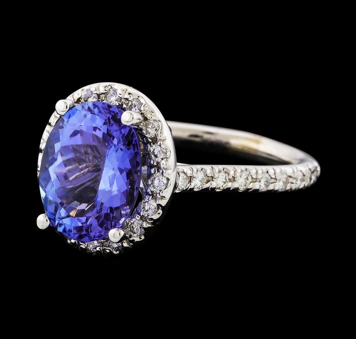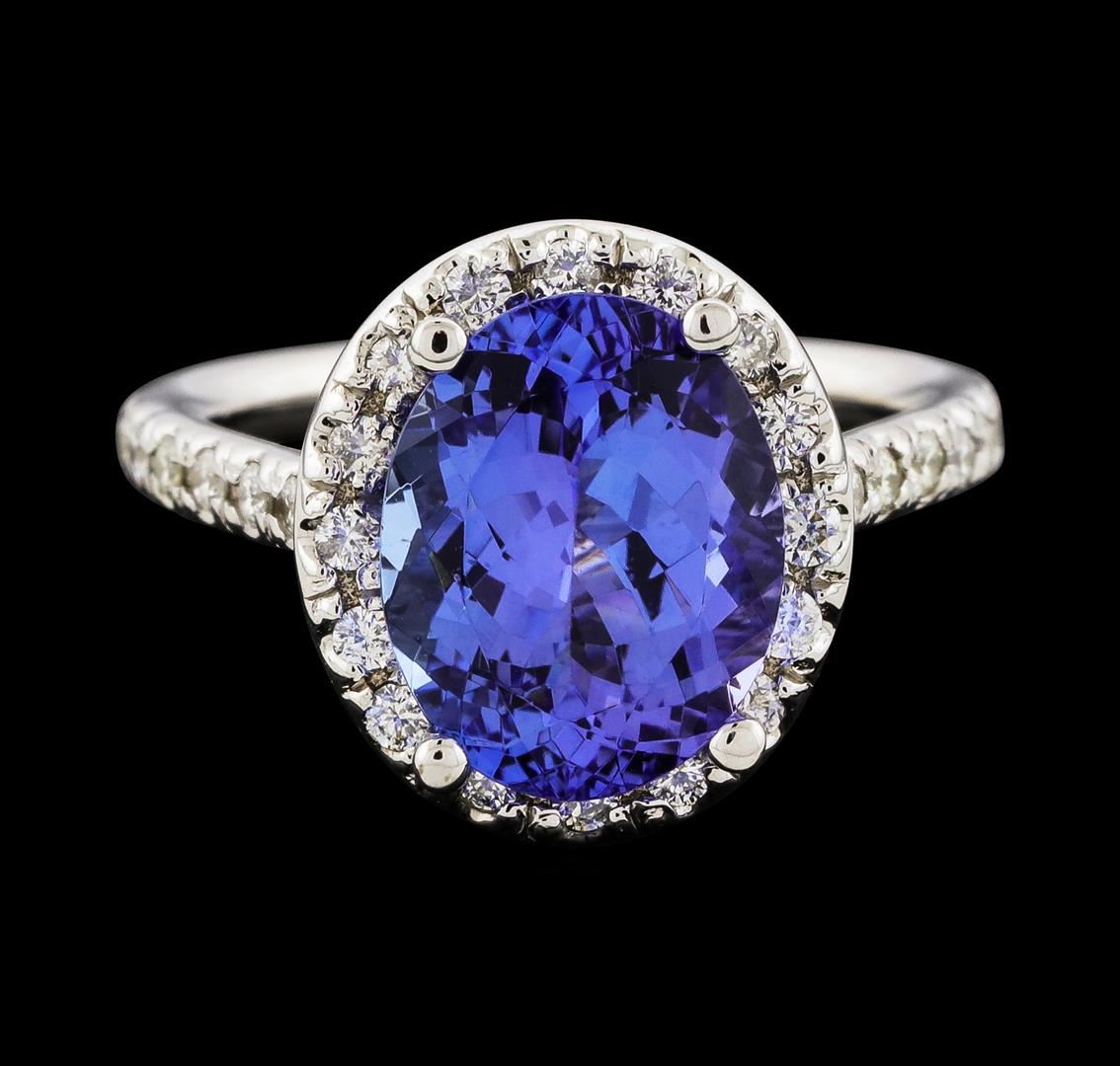 One Tanzanite and Diamond Ring featuring: 14KT White Gold with a total weight of 5.11 grams, One Tanzanite stone with a total weight of 3.80ct, and 34 Diamonds with a total weight of 0.46ctw.