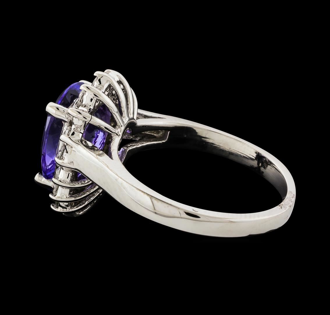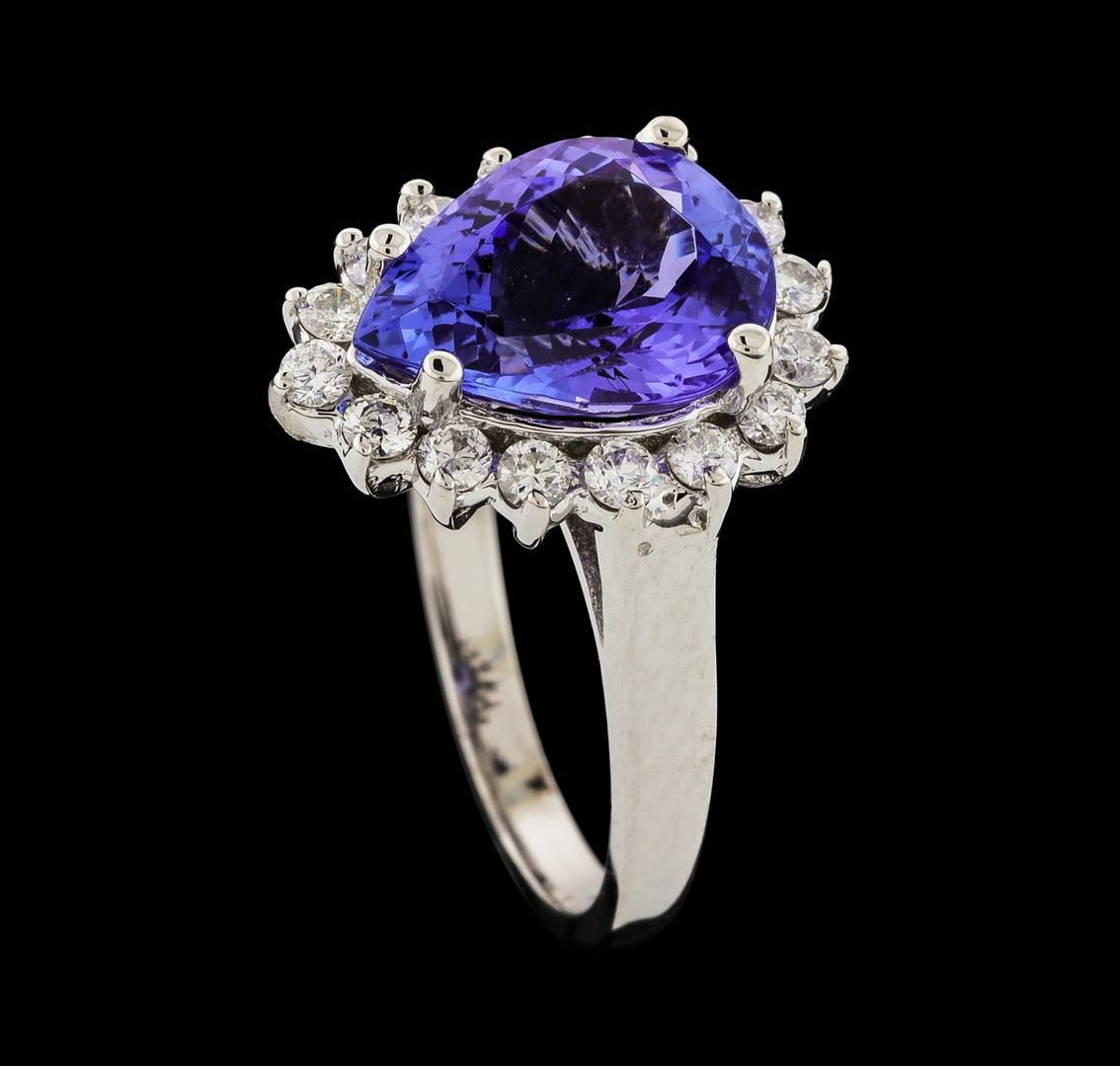 One electronically tested 14KT white gold lady's cast fashion ring with a basket halo with a bright polish finish. The featured lady's ring has a shank measuring 2.17 millimeters wide. Identified with markings of '14K'. Condition is new, good workmanship. Containing: One prong set pear modified brilliant cut natural tanzanite, measuring 11.94 x 9.02 x 5.71mm, (depth est.) approximate weight of 3.84ct., clarity is eye clean, medium, moderately strong, violetish blue color, (GIA vB 5/4), cut is good. Transmitting light with no distortion, transparent. Colored gemstones are presumed to have been subjected to commonly used enhancement processes. Graded in the setting. Sixteen prong set round brilliant cut diamonds, measuring 2.10 - 2.00 x 1.27mm (depth est.) approximate total weight of 16 Stones = 0.52ct. Graded in the setting. Clarity SI-1 to SI-2. Color: H - I Cut Good. Total Weight of Colored Stones 3.84ct.. Total Weight of Diamonds 0.52ct.. Total Weight of Ring 5.20gm GAS Appraised at $7,670.00.