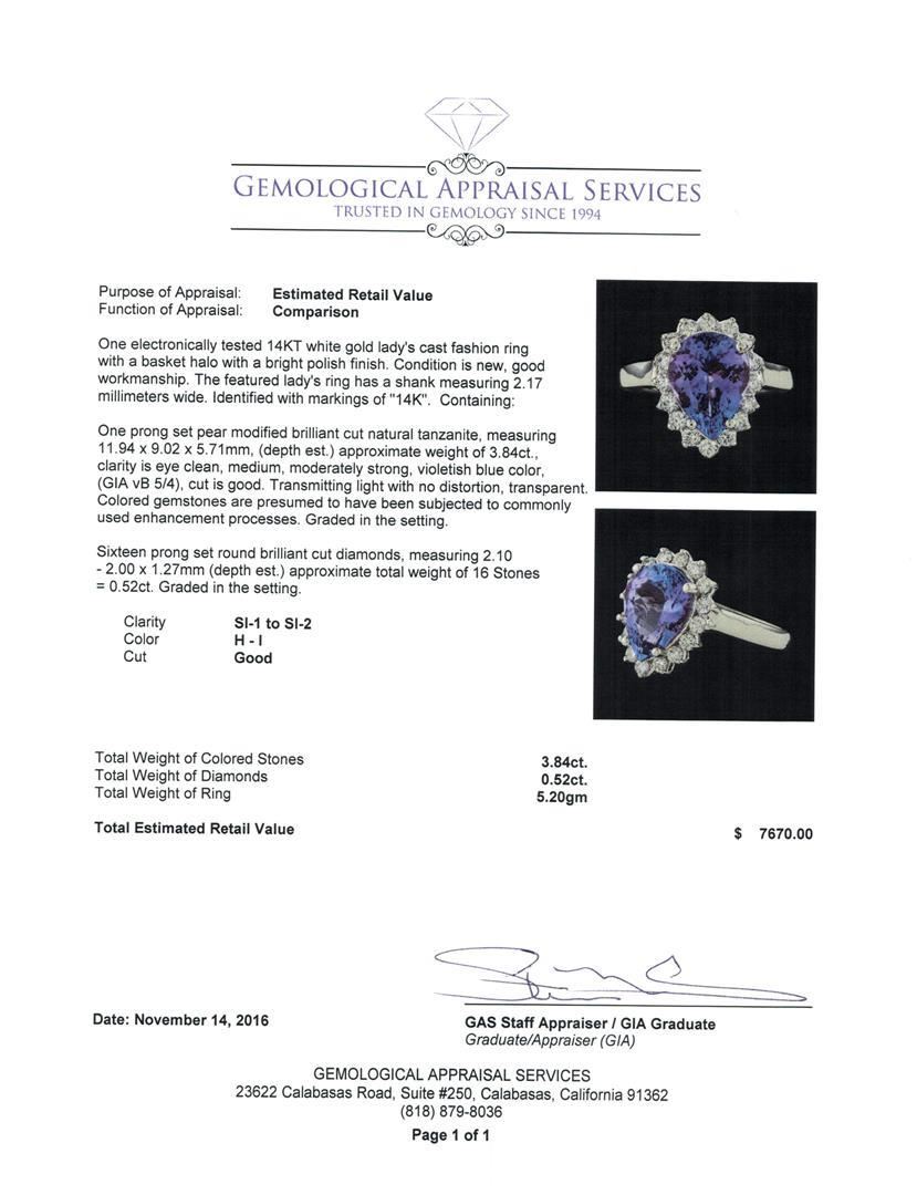 One electronically tested 14KT white gold lady's cast fashion ring with a basket halo with a bright polish finish. The featured lady's ring has a shank measuring 2.17 millimeters wide. Identified with markings of '14K'. Condition is new, good workmanship. Containing: One prong set pear modified brilliant cut natural tanzanite, measuring 11.94 x 9.02 x 5.71mm, (depth est.) approximate weight of 3.84ct., clarity is eye clean, medium, moderately strong, violetish blue color, (GIA vB 5/4), cut is good. Transmitting light with no distortion, transparent. Colored gemstones are presumed to have been subjected to commonly used enhancement processes. Graded in the setting. Sixteen prong set round brilliant cut diamonds, measuring 2.10 - 2.00 x 1.27mm (depth est.) approximate total weight of 16 Stones = 0.52ct. Graded in the setting. Clarity SI-1 to SI-2. Color: H - I Cut Good. Total Weight of Colored Stones 3.84ct.. Total Weight of Diamonds 0.52ct.. Total Weight of Ring 5.20gm GAS Appraised.