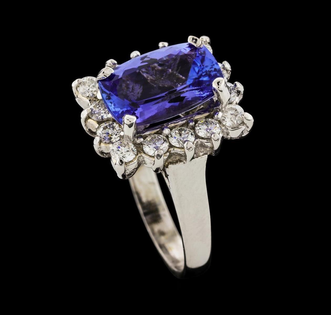 One electronically tested 14KT white gold lady's cast fashion ring with a cathedral shank with a basket halo with a bright polish finish. The featured lady's ring has a shank measuring 2.71 millimeters wide. Identified with markings of '14K'. Condition is new, good workmanship. Containing: One prong set rectangular cushion modified brilliant cut natural tanzanite, measuring 11.84 x 8.01 x 4.95mm, (depth est.) approximate weight of 3.84ct., clarity is eye clean, medium, moderately strong, violetish blue color, (GIA vB 5/4), cut is very good. Transmitting light with no distortion, transparent. Colored gemstones are presumed to have been subjected to commonly used enhancement processes. Graded in the setting. Fourteen prong set round brilliant cut diamonds, measuring 2.60 - 2.50 x 1.58mm (depth est.) approximate total weight of 14 Stones = 0.88ct. Graded in the setting. Clarity SI-1 to SI-2. Color: G - H Cut Good. Total Weight of Colored Stones 3.84ct.. Total Weight of Diamonds 0.88ct.. Total Weight of Ring 6.40gm. GAS Appraised.