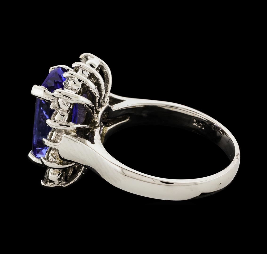 One electronically tested 14KT white gold lady's cast fashion ring with a cathedral shank with a basket halo with a bright polish finish. The featured lady's ring has a shank measuring 2.71 millimeters wide. Identified with markings of '14K'. Condition is new, good workmanship. Containing: One prong set rectangular cushion modified brilliant cut natural tanzanite, measuring 11.84 x 8.01 x 4.95mm, (depth est.) approximate weight of 3.84ct., clarity is eye clean, medium, moderately strong, violetish blue color, (GIA vB 5/4), cut is very good. Transmitting light with no distortion, transparent. Colored gemstones are presumed to have been subjected to commonly used enhancement processes. Graded in the setting. Fourteen prong set round brilliant cut diamonds, measuring 2.60 - 2.50 x 1.58mm (depth est.) approximate total weight of 14 Stones = 0.88ct. Graded in the setting. Clarity SI-1 to SI-2. Color: G - H Cut Good. Total Weight of Colored Stones 3.84ct.. Total Weight of Diamonds 0.88ct.. Total Weight of Ring 6.40gm. GAS Appraised.