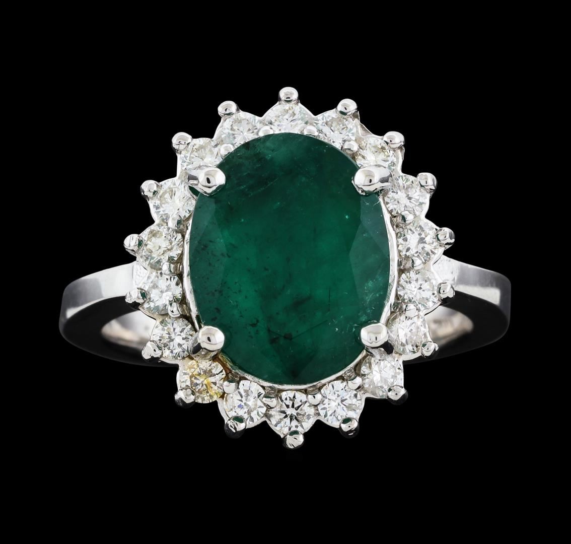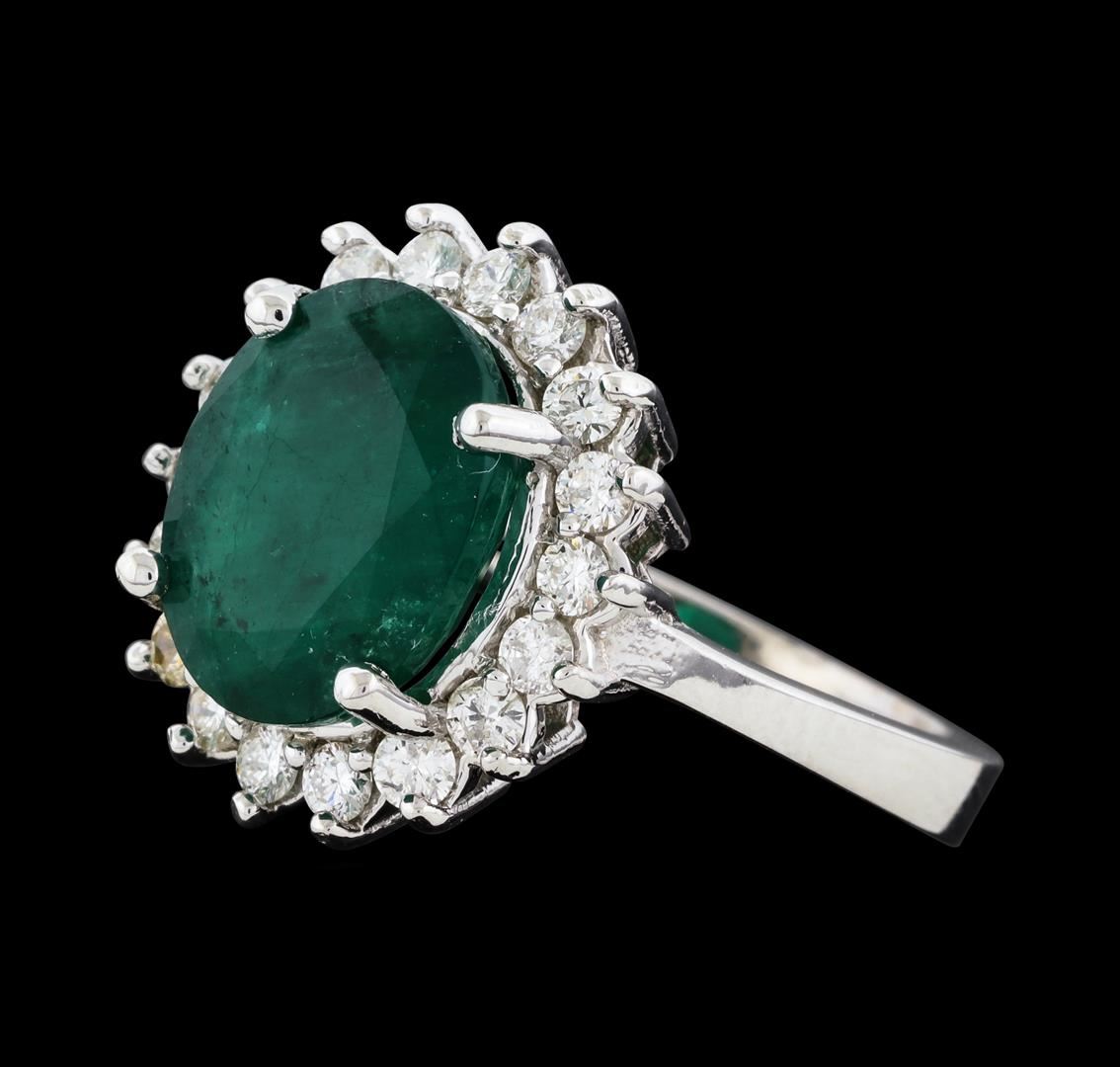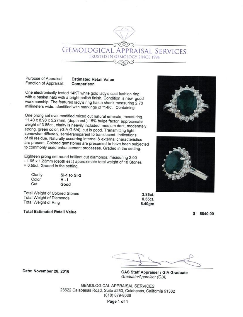 One electronically tested 14KT white gold lady's cast fashion ring with a basket halo with a bright polish finish. The featured lady's ring has a shank measuring 2.70 millimeters wide. Identified with markings of '14K'. Condition is new, good workmanship. Containing: One prong set oval modified mixed cut natural emerald, measuring 11.40 x 8.98 x 5.27mm, (depth est.) 15%. bulge factor, approximate weight of 3.85ct., clarity is heavily included, medium dark, moderately strong, green color, (GIA G 6/4), cut is good. Transmitting light somewhat diffusely, semi-transparent to translucent. Indications of oil residue. Naturally occurring internal & external characteristics are present. Colored gemstones are presumed to have been subjected to commonly used enhancement processes. Graded in the setting. Eighteen prong set round brilliant cut diamonds, measuring 2.00 - 1.95 x 1.23mm (depth est.) approximate total weight of 18 Stones = 0.55ct. Graded in the setting. Clarity SI-1 to SI-2. Color: H - I Cut Good. Total Weight of Colored Stones 3.85ct.. Total Weight of Diamonds 0.55ct.. Total Weight of Ring 6.40gm. GAS Appraised.