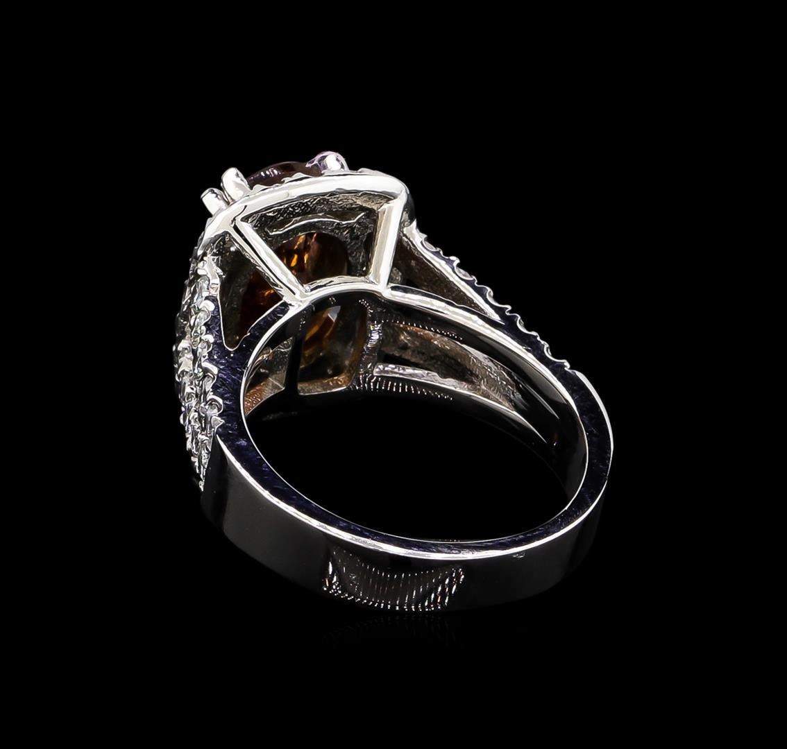 One electronically tested 14KT white gold lady's cast fashion ring with a split shank with a bright polish finish. The featured lady's ring has a shank measuring 3.90 millimeters wide. Identified with markings of "14K". Condition is new, good workmanship. Containing: One prong set oval modified brilliant cut natural golden tourmaline, measuring 12.04 x 8.98 x 5.27mm, 5%. bulge factor, approximate weight of 3.87ct., clarity is slightly included, type II, medium dark, moderately strong, yellowish orange color, (GIA yO 6/4), cut is good. Transmitting light with a minimum of distortion, transparent. Colored gemstones are presumed to have been subjected to commonly used enhancement processes. Graded in the setting. Twenty prong set round brilliant cut diamonds, measuring 2.10 - 2.00 x 1.27mm (depth est.) approximate total weight of 20 Stones = 0.66ct. Graded in the setting. Clarity: SI-1 to SI-2. Color: H - I. Cut Good Twenty prong set round brilliant cut diamonds, measuring 1.90 - 1.80 x 1.15mm (depth est.) approximate total weight of 20 Stones = 0.49ct. Graded in the setting. Clarity: VS-2 to SI-2. Color: H - I. Cut Very Good. Total Weight of Colored Stones 3.87ct. Total Weight of Diamonds 1.15ct. Total Weight of Ring 7.80gm. GAS Appraised.