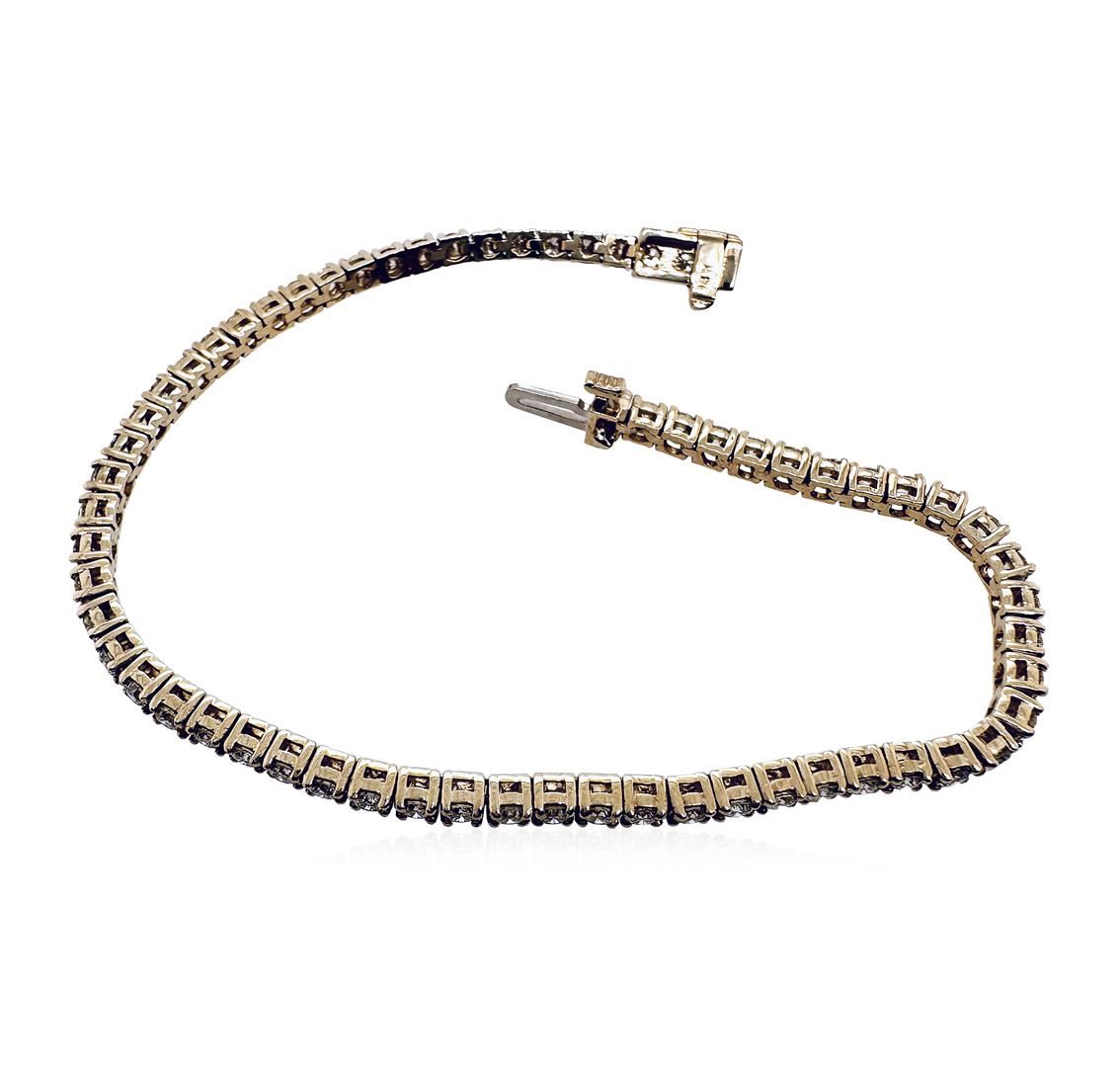 One electronically tested 14KT white gold lady's combination cast & assembled fashion straight line tennis bracelet with a tongue clasp with fold-under safety with a basket motif with a bright polish finish. Condition is new, good workmanship. The featured lady's bracelet measures approximately 7.00 inches in length. Identified with markings of 14K. Containing: 64 prong set round brilliant cut diamonds, approximate total weight of 64 stones = 3.88 ctw. Graded in the setting. Total weight of Diamonds: 3.88 ctw. Total estimated retail value: $9995