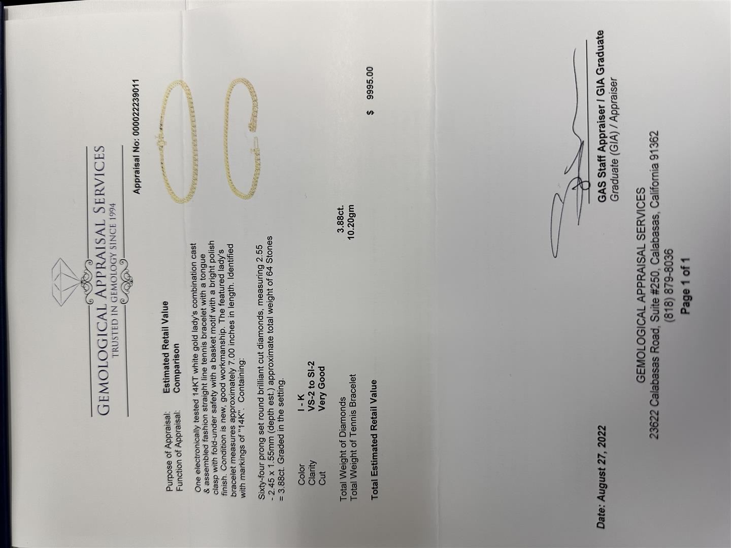 One electronically tested 14KT white gold lady's combination cast & assembled fashion straight line tennis bracelet with a tongue clasp with fold-under safety with a basket motif with a bright polish finish. Condition is new, good workmanship. The featured lady's bracelet measures approximately 7.00 inches in length. Identified with markings of 14K. Containing: 64 prong set round brilliant cut diamonds, approximate total weight of 64 stones = 3.88 ctw. Graded in the setting. Total weight of Diamonds: 3.88 ctw. Total estimated retail value: $9995