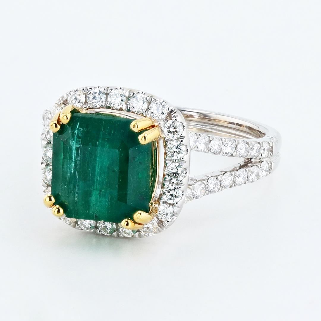 Name of Article: Lady's Emerald and Diamond Ring Setting: 18 Kt. Yellow and White Gold Mounting [5.90 gms] #Additional Stones/Information:# 48 Round Brilliant Cut Diamonds = 0.69 Ctw (Color: E-F, Clarity: VS2-SI2) #Center Gemstone Information:# SPECIES: Natural Beryl VARIETY: Emerald SHAPE AND CUT: Square Emerald Cut Weight: 3.88 Carat Measurements: 8.71 x 8.54 x 6.58mm COLOR HUE: Green SATURATION: Moderately Strong TRANSPARENCY: Transparent