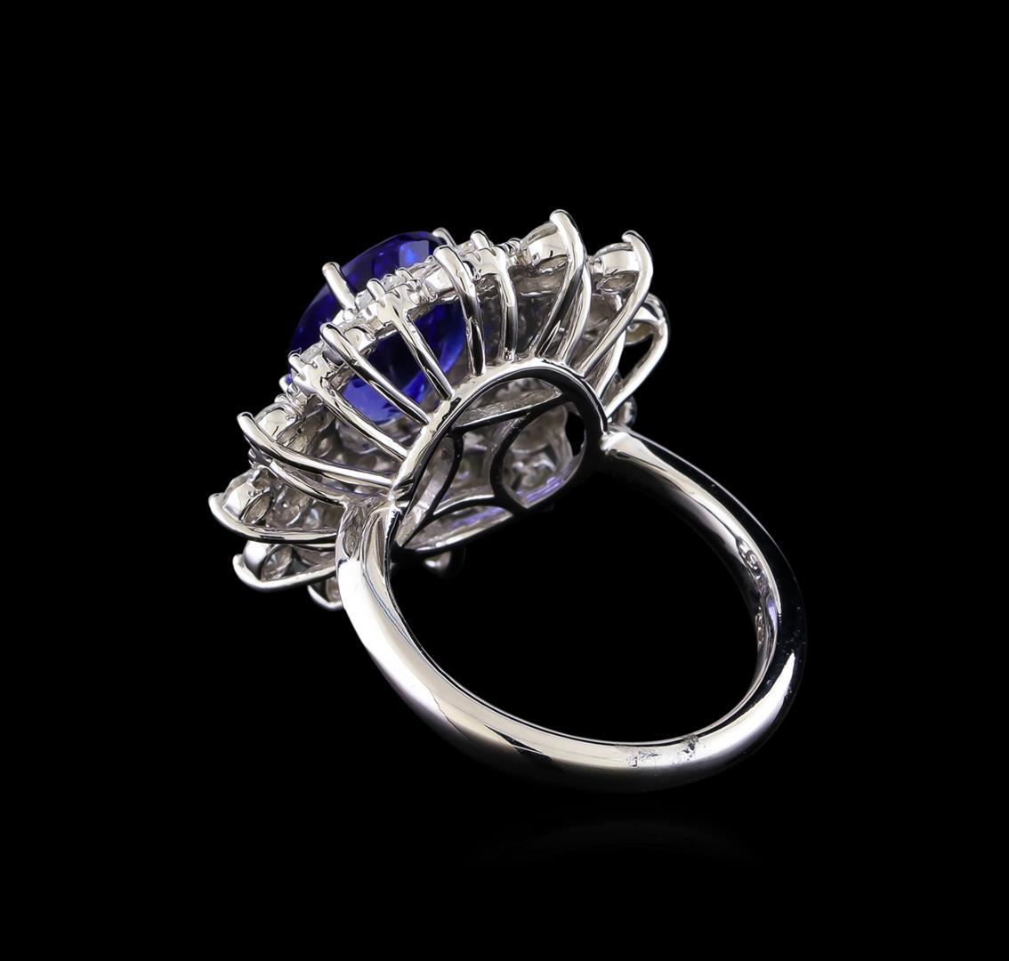 One electronically tested 14KT white gold lady's cast fashion ring with a triple halo with a bright polish finish. The featured lady's ring has a shank measuring 3.0 millimeters in width. Identified with markings of "585". Condition is new, good workmanship. Containing: One prong set oval modified brilliant cut natural tanzanite, measuring 11.00 x 8.03 x 6.00mm, (depth est.) 5%. bulge factor, approximate weight of 3.88ct., clarity is eye clean, medium dark, moderately strong, bluish violet color, (GIA bV 6/4), cut is very good. Transmitting light with no distortion, transparent. Colored gemstones are presumed to have been subjected to commonly used enhancement processes. Graded in the setting. Sixteen prong set round brilliant cut diamonds, measuring 2.00 - 1.90 x 1.21mm (depth est.) approximate total weight of 16 Stones = 0.45ct. Graded in the setting. Clarity: SI-1 to SI-2. Color: H - I. Cut Good Twenty-Four prong set round brilliant cut diamonds, measuring 2.40 - 2.30 x 1.46mm (depth est.) approximate total weight of 24 Stones = 1.20ct. Graded in the setting. Clarity: SI-1 to SI-2. Color: G - I. Cut Good. Total Weight of Colored Stones 3.88ct. Total Weight of Diamonds 1.65ct. Total Weight of Ring 8.20gm. GAS Appraised.