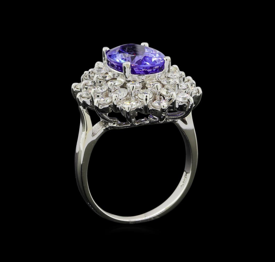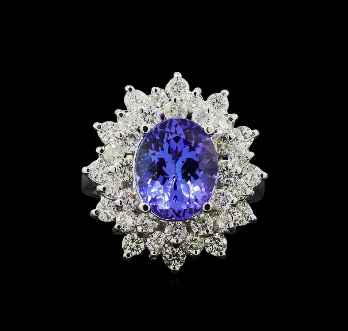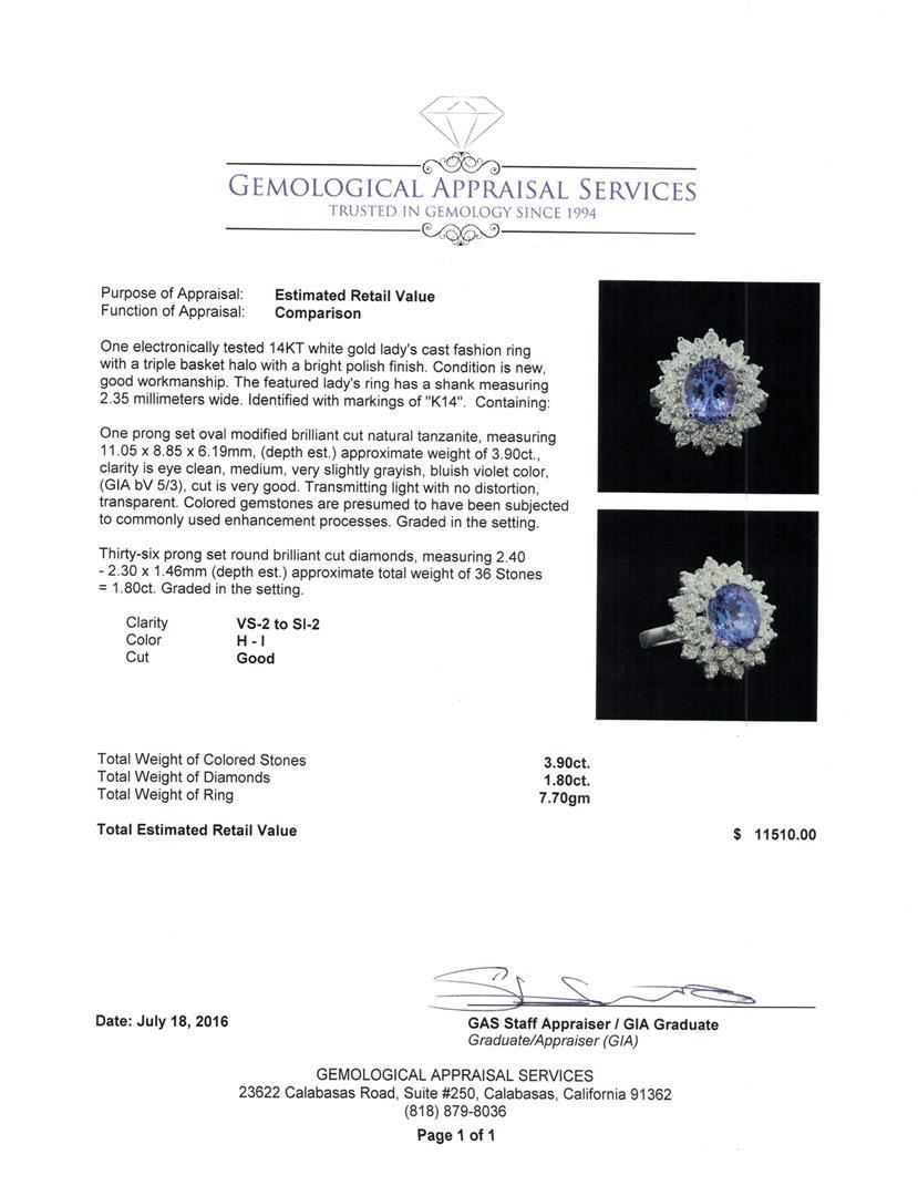 One electronically tested 14KT white gold lady's cast fashion ring with a triple basket halo with a bright polish finish. The featured lady's ring has a shank measuring 2.35 millimeters wide. Identified with markings of 'K14'. Condition is new, good workmanship. Containing: One prong set oval modified brilliant cut natural tanzanite, measuring 11.05 x 8.85 x 6.19mm, (depth est.) approximate weight of 3.90ct., clarity is eye clean, medium, very slightly grayish, bluish violet color, (GIA bV 5/3), cut is very good. Transmitting light with no distortion, transparent. Colored gemstones are presumed to have been subjected to commonly used enhancement processes. Graded in the setting. Thirty-Six prong set round brilliant cut diamonds, measuring 2.40 - 2.30 x 1.46mm (depth est.) approximate total weight of 36 Stones = 1.80ct. Graded in the setting. Clarity VS-2 to SI-2. Color: H - I Cut Good. Total Weight of Colored Stones 3.90ct.. Total Weight of Diamonds 1.80ct.. Total Weight of Ring 7.70gm. GAS Appraised.