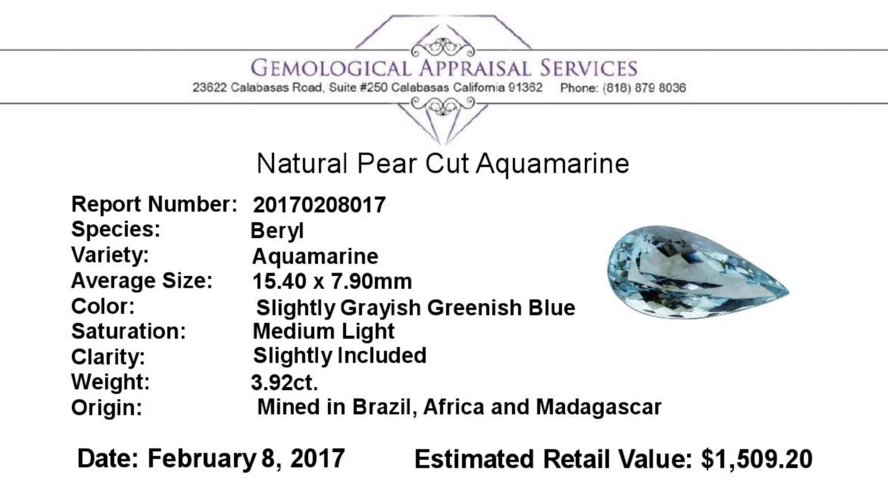 One natural pear cut aquamarine with an exact weight of 3.92ct., clarity is slightly included, slightly grayish greenish blue, medium light. Gemological Appraisals Services estimates the retail value at $1509.2 GAS Appraised.