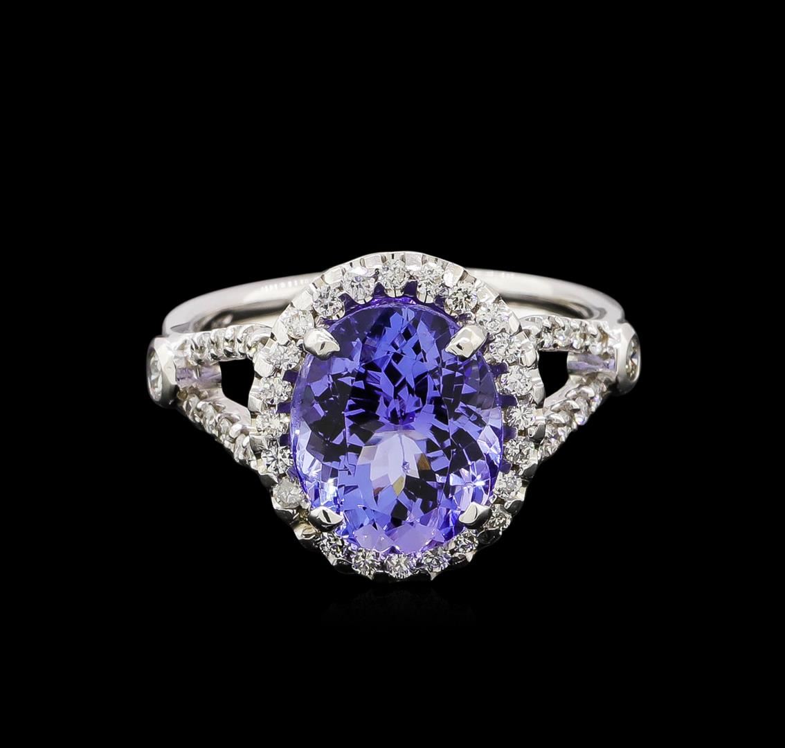 One electronically tested 14KT white gold lady's cast fashion ring with a halo with a bright polish finish. The featured lady's ring has a shank measuring 3.42 millimeters wide. Identified with markings of '14K'. Condition is new, good workmanship. Containing: One prong set oval modified brilliant cut natural tanzanite, measuring 10.65 x 8.30 x 5.95mm, (depth est.) 5%. bulge factor, approximate weight of 3.96ct., clarity is eye clean, medium, moderately strong, violetish blue color, (GIA vB 5/4), cut is very good. Transmitting light with no distortion, transparent. Colored gemstones are presumed to have been subjected to commonly used enhancement processes. Graded in the setting. Forty-Two prong set round brilliant cut diamonds, measuring 1.45 - 1.35 x 0.87mm (depth est.) approximate total weight of 42 Stones = 0.45ct. Graded in the setting. Clarity SI-1 to SI-2. Color: H - I Cut Good Forty-Eight prong set round brilliant cut diamonds, measuring 1.30 - 1.20 x 0.78mm (depth est.) approximate total weight of 48 Stones = 0.37ct. Graded in the setting. Clarity SI-1 to SI-2. Color: H - I Cut Good. Total Weight of Colored Stones 3.96ct.. Total Weight of Diamonds 0.82ct.. Total Weight of Ring 6.60gm. GAS Appraised at $9,840.00.