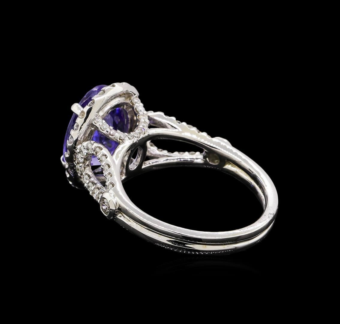 One electronically tested 14KT white gold lady's cast fashion ring with a halo with a bright polish finish. The featured lady's ring has a shank measuring 3.42 millimeters wide. Identified with markings of '14K'. Condition is new, good workmanship. Containing: One prong set oval modified brilliant cut natural tanzanite, measuring 10.65 x 8.30 x 5.95mm, (depth est.) 5%. bulge factor, approximate weight of 3.96ct., clarity is eye clean, medium, moderately strong, violetish blue color, (GIA vB 5/4), cut is very good. Transmitting light with no distortion, transparent. Colored gemstones are presumed to have been subjected to commonly used enhancement processes. Graded in the setting. Forty-Two prong set round brilliant cut diamonds, measuring 1.45 - 1.35 x 0.87mm (depth est.) approximate total weight of 42 Stones = 0.45ct. Graded in the setting. Clarity SI-1 to SI-2. Color: H - I Cut Good Forty-Eight prong set round brilliant cut diamonds, measuring 1.30 - 1.20 x 0.78mm (depth est.) approximate total weight of 48 Stones = 0.37ct. Graded in the setting. Clarity SI-1 to SI-2. Color: H - I Cut Good. Total Weight of Colored Stones 3.96ct.. Total Weight of Diamonds 0.82ct.. Total Weight of Ring 6.60gm.