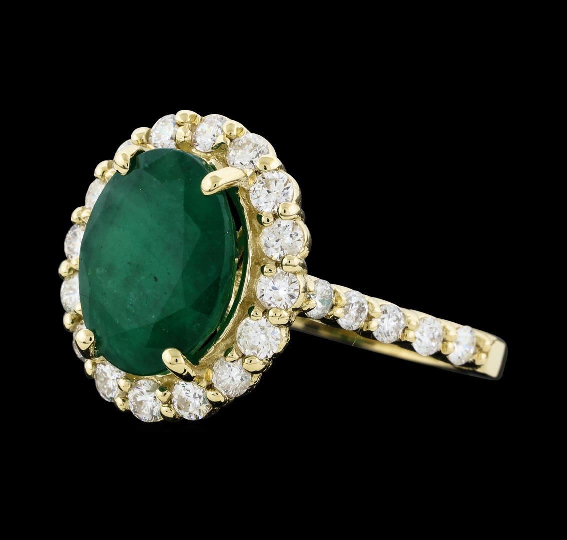 One electronically tested 14KT yellow gold lady's cast fashion ring with a cathedral shank with a halo with a bright polish finish. The featured lady's ring has a shank measuring 2.10 millimeters wide. Identified with markings of '14K'. Condition is new, good workmanship. Containing: One prong set oval modified mixed cut natural emerald, measuring 11.65 x 9.00 x 5.90mm, (depth est.) 10%. bulge factor, approximate weight of 3.98ct., clarity is heavily included, medium dark, moderately strong, green color, (GIA G 6/4), cut is good. Transmitting light somewhat diffusely, transparent to translucent. Indications of oil residue. Naturally occurring internal & external characteristics are present. Colored gemstones are presumed to have been subjected to commonly used enhancement processes. Graded in the setting. Sixteen prong set round brilliant cut diamonds, measuring 2.30 - 2.20 x 1.35mm (depth est.) approximate total weight of 16 Stones = 0.67ct. Graded in the setting. Clarity SI-1 to I-1. Color: H - I Cut Good Twelve prong set round brilliant cut diamonds, measuring 2.10 - 2.00 x 1.23mm (depth est.) approximate total weight of 12 Stones = 0.38ct. Graded in the setting. Clarity SI-1 to SI-3. Color: H - I Cut Good. Total Weight of Colored Stones 3.98ct.. Total Weight of Diamonds 1.05ct.. Total Weight of Ring 5.50gm. GAS Appraised.