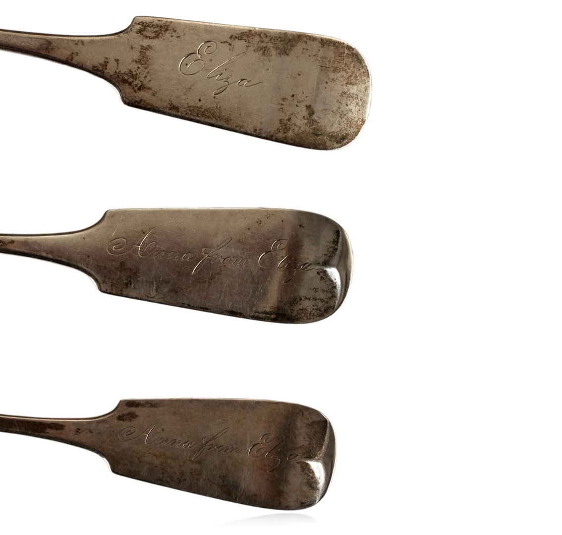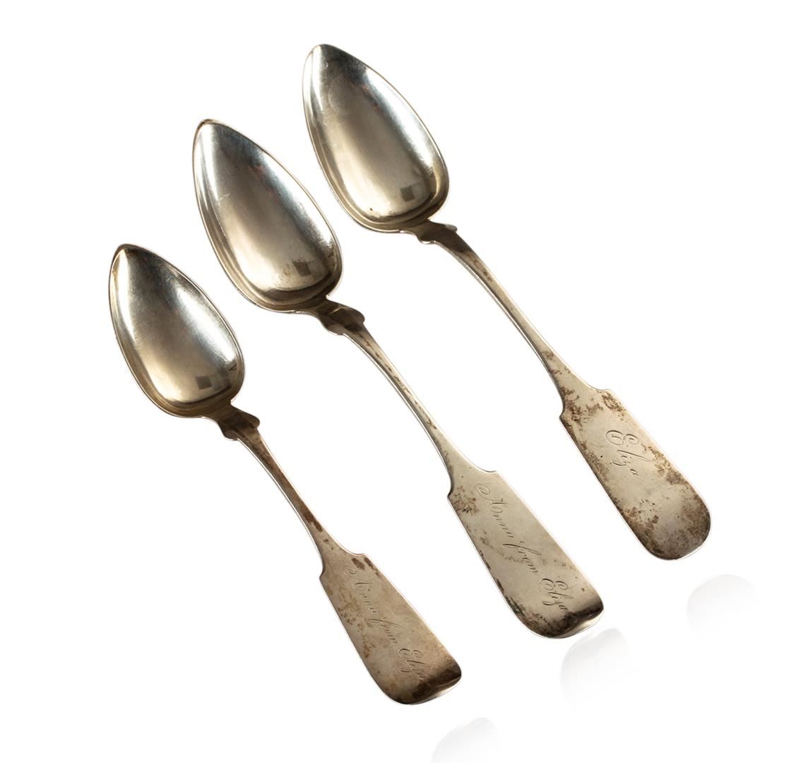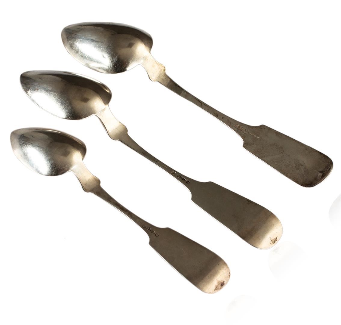 Fine pair of American Coin Silver Serving Spoons and one table spoon Fiddle tip pattern. RL Samson. NY. Original condition no repairs.