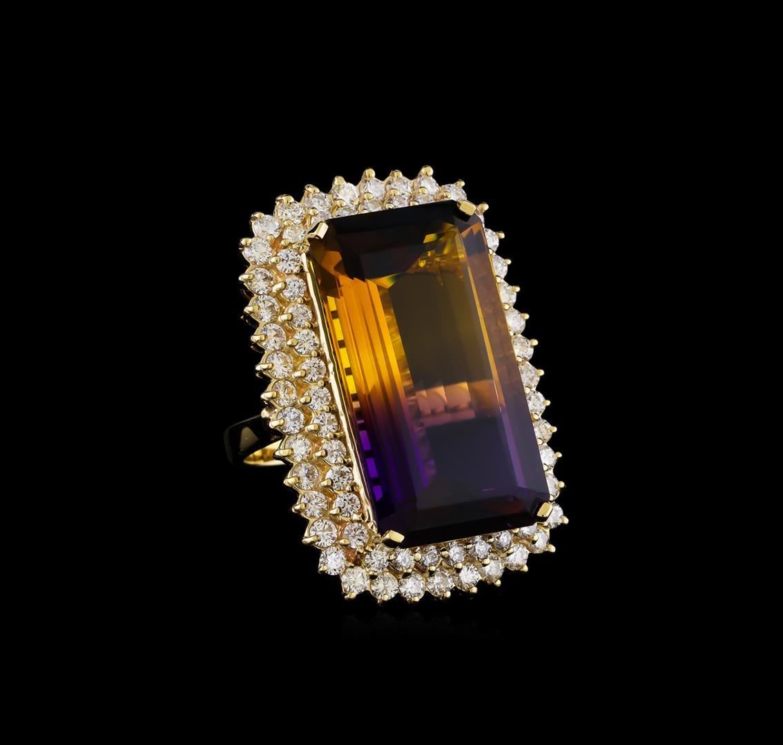 One electronically tested 14KT yellow gold lady's cast fashion ring with a double basket halo with a bright polish finish. The featured lady's ring has a shank measuring 3.25 millimeters in width. Identified with markings of "K14". Condition is new, good workmanship. Containing: One prong set emerald step cut natural ametrine quartz, measuring 28.00 x 15.60 x 9.10mm, (depth est.) approximate weight of 30.06ct., clarity is eye clean, dark, moderately strong, purple color, (GIA P 7/4) to medium dark, moderately strong, yellowish orange, (GIA yO 6/4), cut is very good. Transmitting light with no distortion, transparent. Colored gemstones are presumed to have been subjected to commonly used enhancement processes. Graded in the setting. Forty prong set round brilliant cut diamonds, measuring 2.40 - 2.30 x 1.43mm (depth est.) approximate total weight of 40 Stones = 1.87ct. Graded in the setting. Clarity: VS-2 to SI-2. Color: H - I. Cut Good Thirty-Six prong set round brilliant cut diamonds, measuring 2.10 - 2.00 x 1.25mm (depth est.) approximate total weight of 36 Stones = 1.15ct. Graded in the setting. Clarity: VS-2 to SI-2. Color: H - I. Cut Good. Total Weight of Colored Stones 30.06ct. Total Weight of Diamonds 3.02ct. Total Weight of Ring 20.30gm. GAS Appraised.
