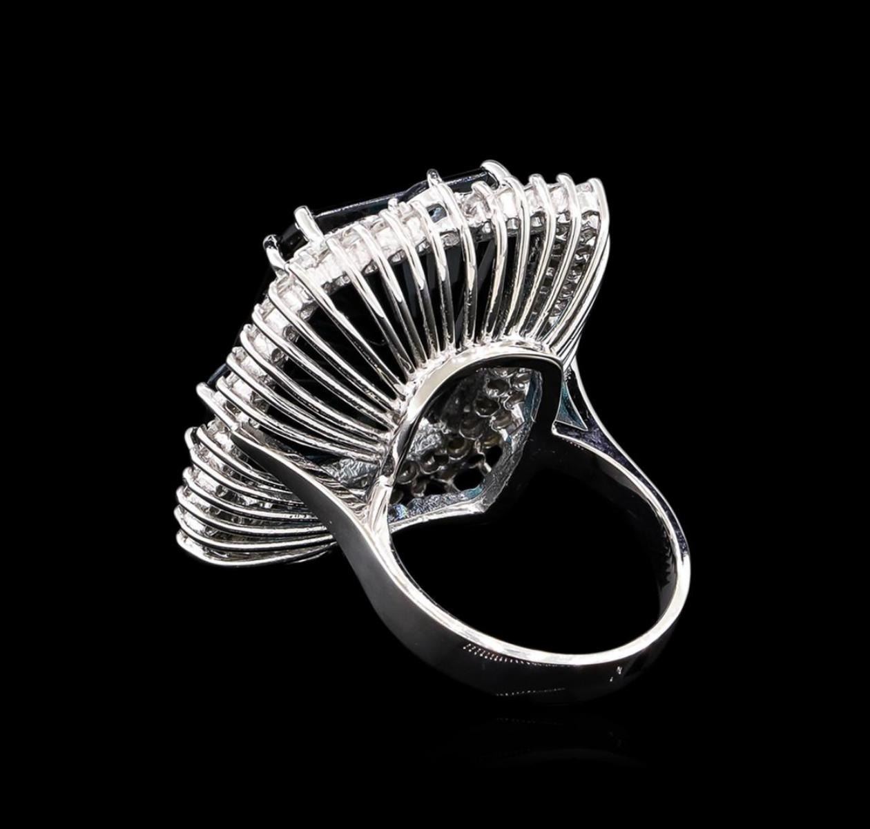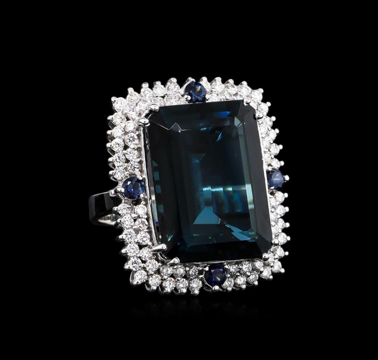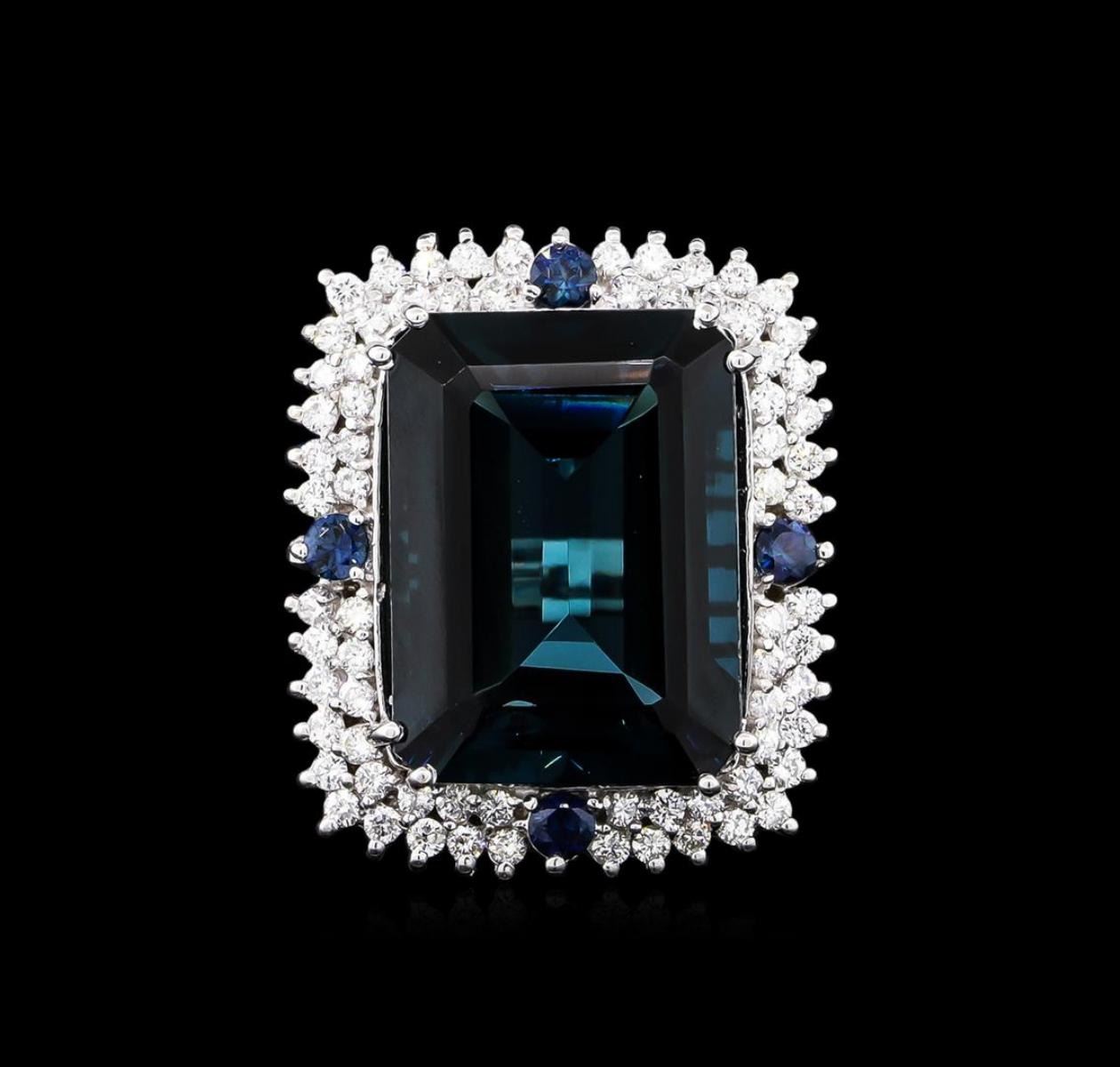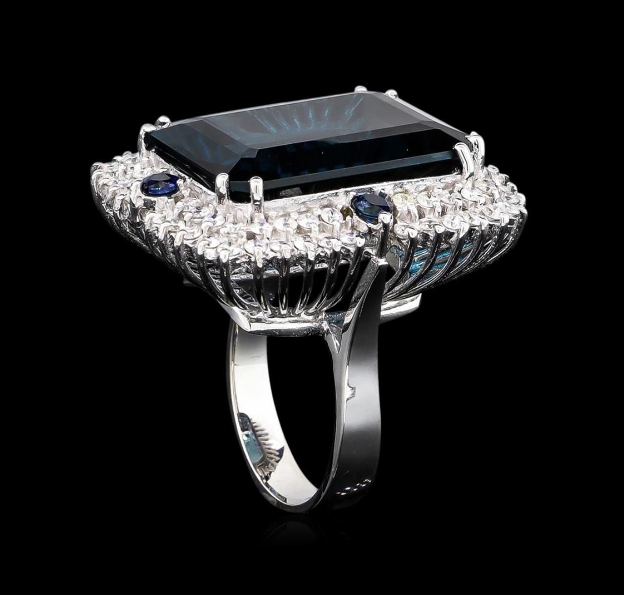 One electronically tested 14KT white gold lady's cast fashion ring with a basket double halo with a bright polish finish. The featured lady's ring has a shank measuring 3.99 millimeters wide. Identified with markings of "K14". Condition is new, good workmanship. Containing: One prong set emerald step cut natural blue topaz, measuring 21.79 x 16.01 x 9.05mm, approximate weight of 29.62ct., clarity is eye clean, type I, dark, very slightly grayish, greenish blue color, (GIA gB 7/3), cut is very good. Transmitting light with no distortion, transparent. Colored gemstones are presumed to have been subjected to commonly used enhancement processes. Graded in the setting. Four prong set round modified brilliant cut natural blue sapphires, measuring 3.10 - 3.00 x 1.98 mm, approximate total weight of 0.58ct., clarity is slightly included, type II, medium, very slightly grayish, blue color, (GIA B 5/3), cut is good. Colored gemstones are presumed to have been subjected to commonly used enhancement processes. Graded in the setting. Seventy-Two prong set round brilliant cut diamonds, measuring 1.80 - 1.75 x 1.10mm (depth est.) approximate total weight of 72 Stones = 1.55ct. Graded in the setting. Clarity: SI-1 to SI-2. Color: H - I. Cut Good. Total Weight of Colored Stones 30.20ct. Total Weight of Diamonds 1.55ct. Total Weight of Ring 20.70gm. GAS Appraised at $7,305.00.