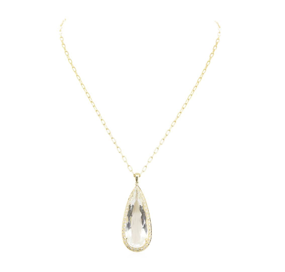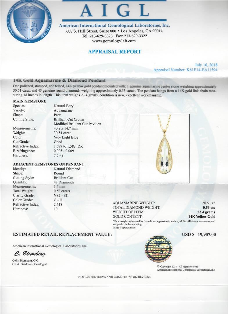 One polished, stamped, and tested, 14K yellow gold pendant mounted with: 1 genuine aquamarine center stone weighing approximately 30.51 carat, and 43 genuine round diamonds weighing approximately 0.53 carats. The pendant hangs from a 14K gold link chain measuring 18 inches in length. This item weighs 23.4 grams, condition is new, excellent workmanship. Main Gemstone- Species: Natural Beryl. Variety: Aquamarine. Shape: Pear. Cutting Style: Brilliant cut crown, modified brilliant cut pavilion. Measurements: 40.8x14.7mm. Weight: 30.51 carat. Color Very light blue. Cut grade: Good. Refractive index: 1.577 to 1.583 DR. Birefringence: 0.005-0.009 Hardness 7.5-8. Adjacent Diamond - Identity: Natural diamond. Shape: Round. Cutting Style: Brilliant cut. Quantity: 43 Diamonds. Measurements: 1.4mm. Total weight: 0.53 carats. Clarity Grade: VS1-SI1. Color Grade: G-H. Refractive index: 2.418 Hardness: 10. Aquamarine weight: 30.51ct. Total diamond weight: 0.53cts. Weight of item: 23.4gm Gold content: 14KT yellow gold. Estimated retail replacement value: $19,957.00 US