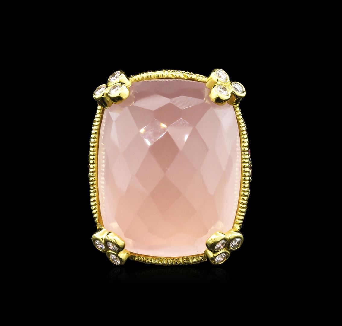 One electronically tested 18KT yellow gold ladies cast multi gemstone and diamond ring. Condition is good. The ring is from Judith Ripka's Monaco Collection. The ring features a rose quartz set within diamond accented prongs supported by a pink sapphire and diamond under gallery and pink sapphire set shoulders, completed by a patterned four and one-half millimeter wide band. Bright and anodized finish. Trademark is JR. Identified with markings of "18K". Containing: One prong set rectangular cushion cabochon mixed cut natural rose quartz, measuring 25.00 x 20.00 x 8.50mm, approximate weight of 30.62ct., clarity is heavily included, medium dark, very slightly grayish, pink color, (GIA Pk 6/3), cut is good. Transmitting light somewhat diffusely, translucent. Naturally occurring internal & external characteristics are present. Graded in the setting. Ninety-four prong set round mixed cut natural pink sapphires, measuring 2.10 - 1.90 x 1.30 mm, approximate total weight of 4.70ct., clarity is eye clean, type II, medium, very slightly brownish, slightly purplish red color, (GIA slpR 5/3), cut is good. Transmitting light with no distortion, transparent. Color grade is an average for the group. Graded in the setting. Twenty-four prong and bezel set round brilliant cut diamonds, measuring 2.00 - 1.80 x 1.14mm (depth est.) approximate total weight of 24 Stones = 0.70ct. Graded in the setting. Clarity: VVS-2 to VS-1. Color: F - H. Total Weight of Colored Stones: 35.32ct. Total Weight of Diamonds: 0.70ct. Total Weight of Ring: 33.18 gm. AIG Appraised.