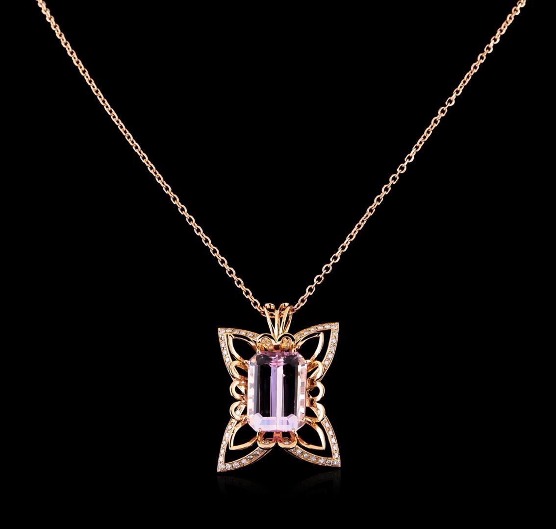 One electronically tested 14KT rose gold ladies cast & assembled kunzite and diamond pendant with chain. The pendant features a kunzite set within a tiered butterfly style diamond set bezel completed by a split bail. The pendant is supported by a twenty inch length 14KT rose gold cable chain, terminating in a lobster claw clasp. Bright polish finish. Condition is new, good workmanship. Containing: One prong set rectangular step cut natural kunzite, measuring 21.40 x 15.50 x 10.60mm, approximate weight of 31.25ct. with a medium Orange fluorescence, clarity is eye clean, light, very slightly grayish, pink color, (GIA Pk 3/3), cut is good. Transmitting light with no distortion, transparent. Colored Stone Grading Report attached. Graded in the setting. Sixty-Four prong set round brilliant cut diamonds, measuring 1.80 - 1.80 x 1.08mm (depth est.) approximate total weight of 64 Stones = 1.40ct. Color & clarity grade are an average for the group. Graded in the setting. Clarity: SI-2 to I-2. Color: G - H. Total Weight of Colored Stones 31.25ct. Total Weight of Diamonds 1.40ct. Total Weight of Pendant With Chain 26.69gm. AIG Appraised at $15,775.00.