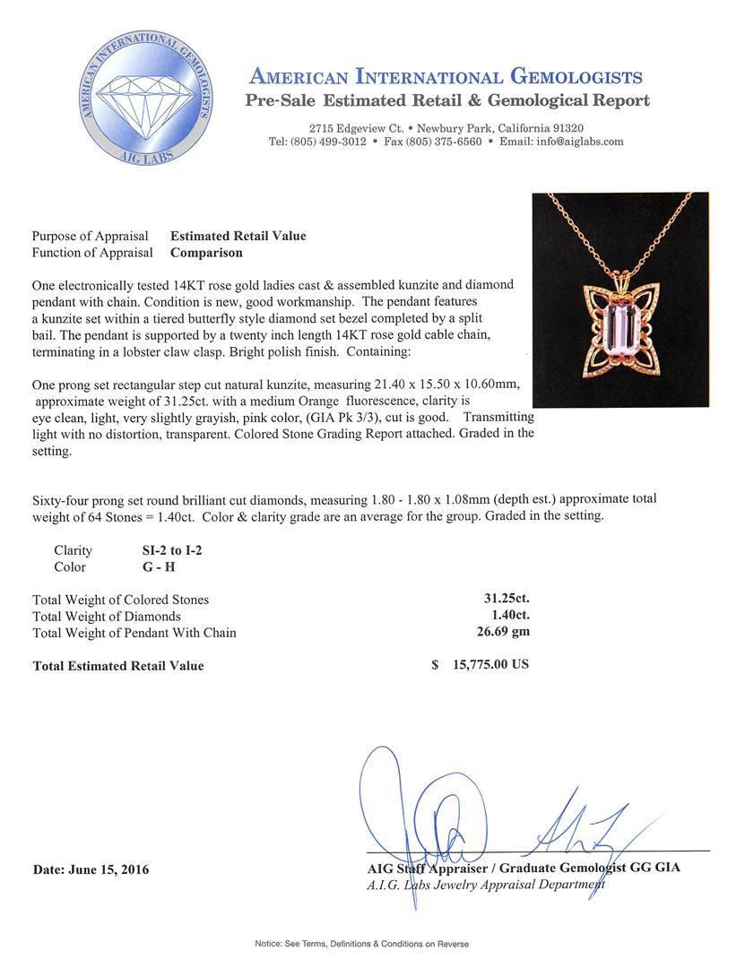 One electronically tested 14KT rose gold ladies cast & assembled kunzite and diamond pendant with chain. The pendant features a kunzite set within a tiered butterfly style diamond set bezel completed by a split bail. The pendant is supported by a twenty inch length 14KT rose gold cable chain, terminating in a lobster claw clasp. Bright polish finish. Condition is new, good workmanship. Containing: One prong set rectangular step cut natural kunzite, measuring 21.40 x 15.50 x 10.60mm, approximate weight of 31.25ct. with a medium Orange fluorescence, clarity is eye clean, light, very slightly grayish, pink color, (GIA Pk 3/3), cut is good. Transmitting light with no distortion, transparent. Colored Stone Grading Report attached. Graded in the setting. Sixty-Four prong set round brilliant cut diamonds, measuring 1.80 - 1.80 x 1.08mm (depth est.) approximate total weight of 64 Stones = 1.40ct. Color & clarity grade are an average for the group. Graded in the setting. Clarity: SI-2 to I-2. Color: G - H. Total Weight of Colored Stones 31.25ct. Total Weight of Diamonds 1.40ct. Total Weight of Pendant With Chain 26.69gm. AIG Appraised.