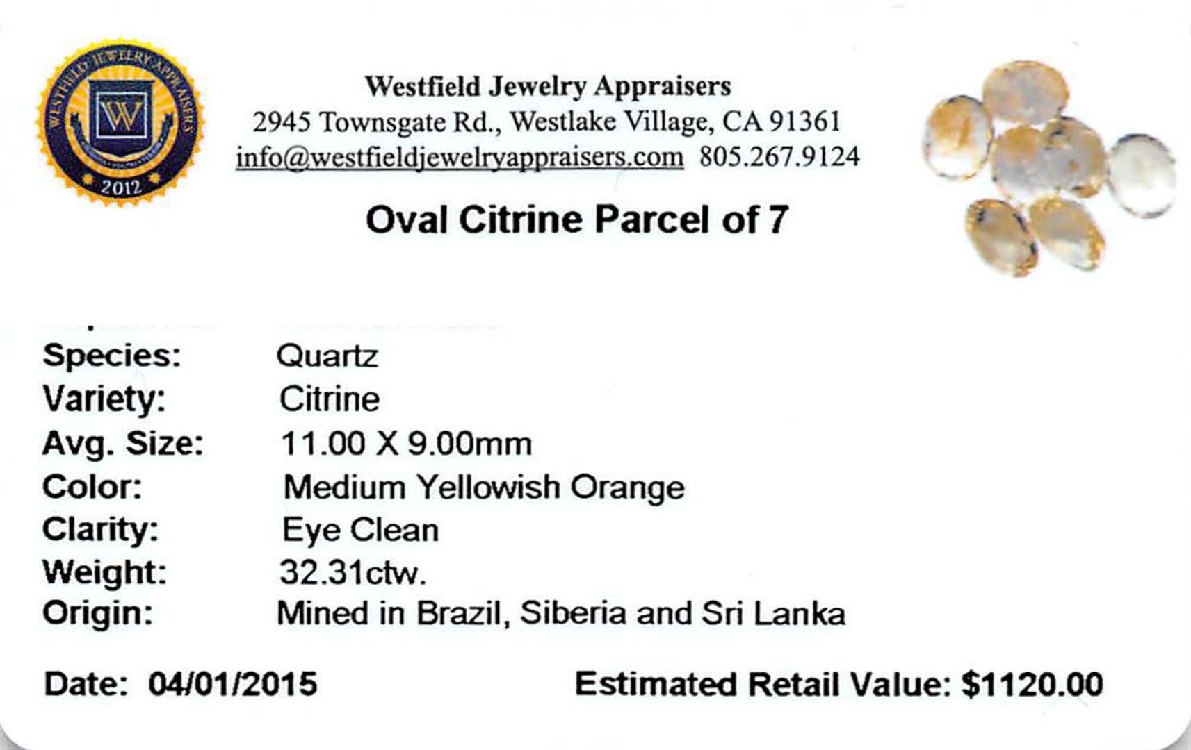 Seven oval mixed cut natural citrine quartzs exact total weight 32.31ct., clarity is eye clean, type I, medium, slightly brownish, yellowish orange color, (GIA yO 5/2), cut is good. Westfield Appraised.