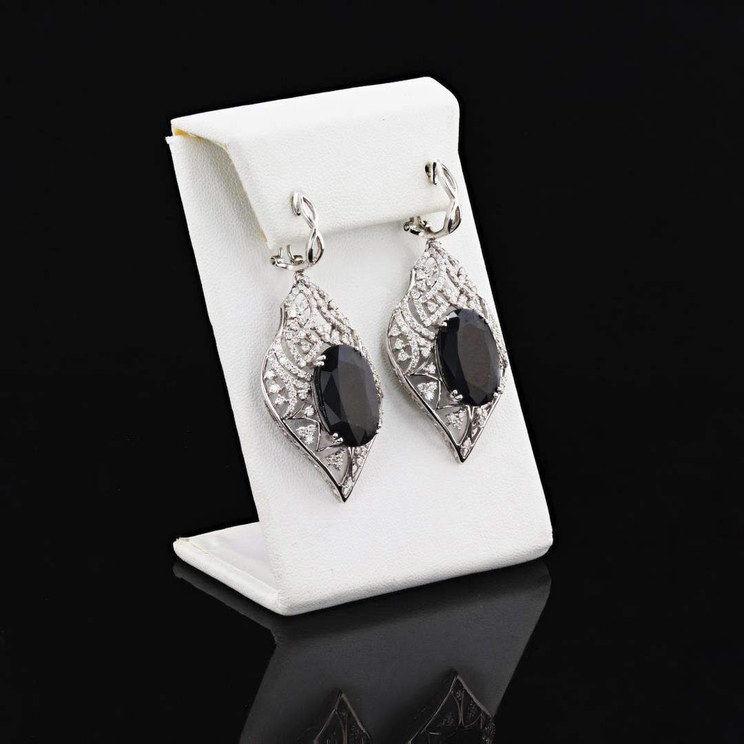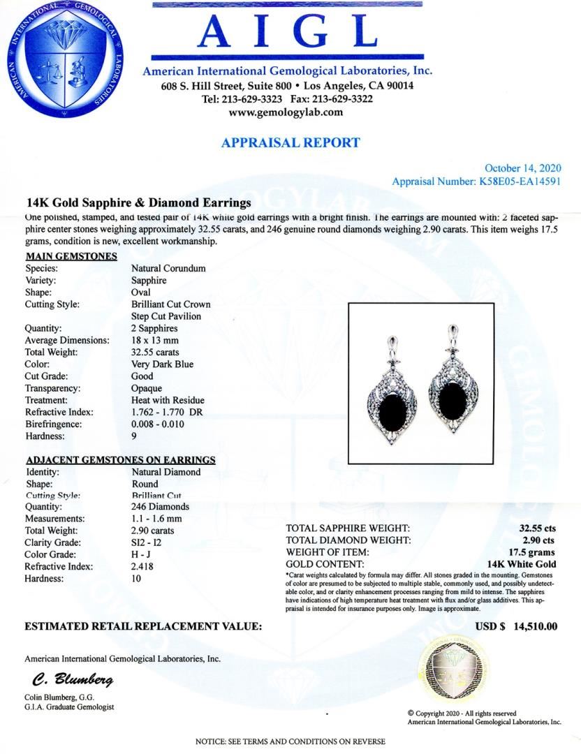 One polished, stamped, and tested pair of 14K white gold earrings with a bright finish. The earrings are mounted with: 2 faceted sapphire center stones weighing approximately 32.55 carats, and 246 genuine round diamonds weighing 2.90 carats. This item weighs 17.5 grams, condition is new, excellent workmanship. MAIN GEMSTONES Species: Natural Corundum Variety: Sapphire Shape: Oval Cutting Style: Brilliant Cut Crown Step Cut Pavilion Quantity: 2 Sapphires Average Dimensions: 18 x 13mm Total Weight: 32.55 carats Color: Very Dark Blue Cut Grade: Good Transparency: Opaque Treatment: Heat with Residue Refractive Index: 1.762 - 1.770 DR Birefringence: 0.008 - 0.010 Hardness: 9 ADJACENT GEMSTONES ON EARRINGS Identity: Natural Diamond Shape: Round Cutting Style: Brilliant Cut Quantity: 246 Diamonds Measurements: 1.1 - 1.6mm Total Weight: 2.90 carats Clarity Grade: SI2 to I2 Color Grade: H - J Refractive Index: 2.418 Hardness: 10 TOTAL SAPPHIRE WEIGHT: 32.55ctw TOTAL DIAMOND WEIGHT: 2.90ctw WEIGHT OF ITEM: 17.5 grams GOLD CONTENT: 14K White Gold