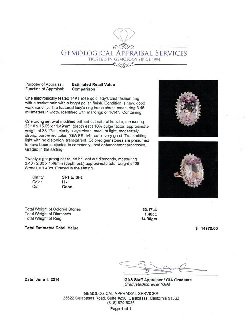 One electronically tested 14KT rose gold lady's cast fashion ring with a basket halo with a bright polish finish. The featured lady's ring has a shank measuring 3.45 millimeters in width. Identified with markings of "K14". Condition is new, good workmanship. Containing: One prong set oval modified brilliant cut natural kunzite, measuring 23.10 x 15.65 x 11.49mm, (depth est.) 10%. bulge factor, approximate weight of 33.17ct., clarity is eye clean, medium light, moderately strong, purple red color, (GIA PR 4/4), cut is very good. Transmitting light with no distortion, transparent. Colored gemstones are presumed to have been subjected to commonly used enhancement processes. Graded in the setting. Twenty-Eight prong set round brilliant cut diamonds, measuring 2.40 - 2.30 x 1.46mm (depth est.) approximate total weight of 28 Stones = 1.40 ct. Graded in the setting. Clarity: SI-1 to SI-2. Color: H - I. Cut Good. Total Weight of Colored Stones 33.17ct. Total Weight of Diamonds 1.40 ct. Total Weight of Ring 14.90gm. GAS Appraised.