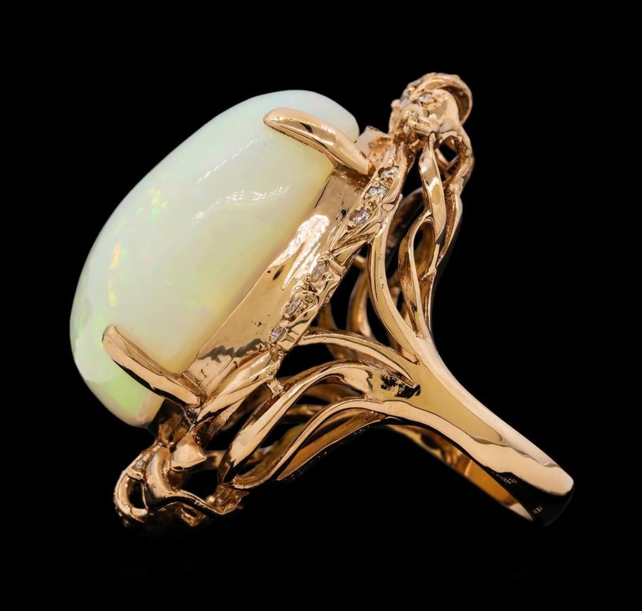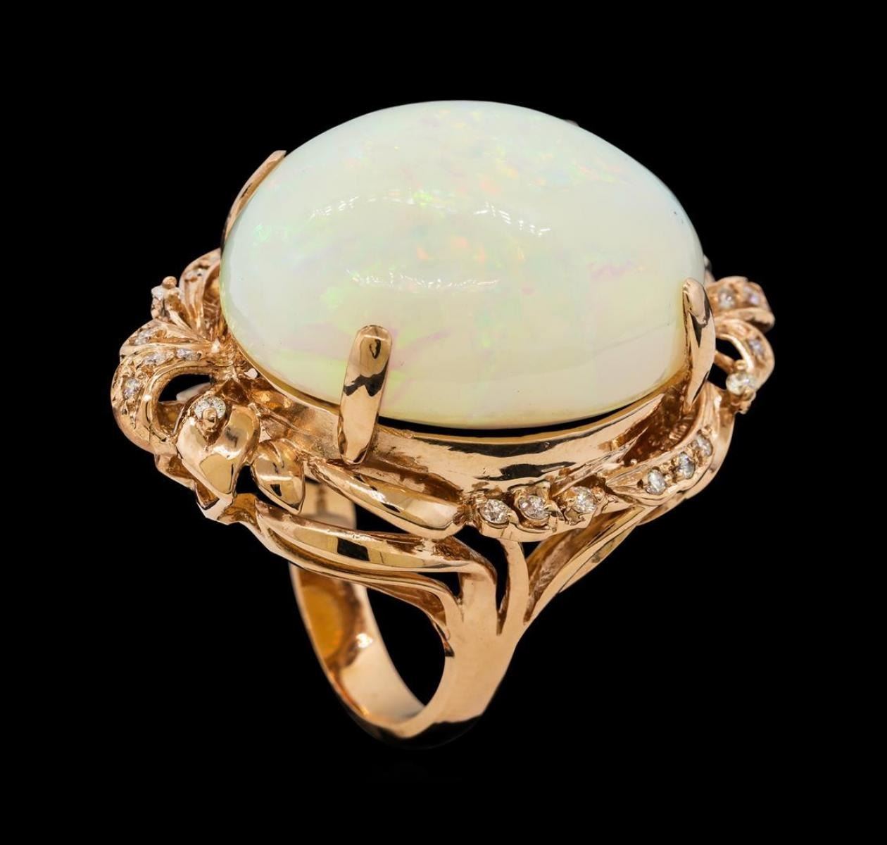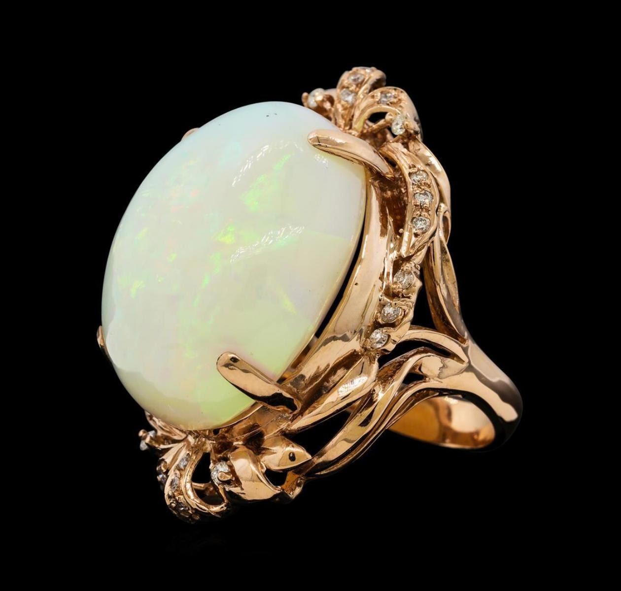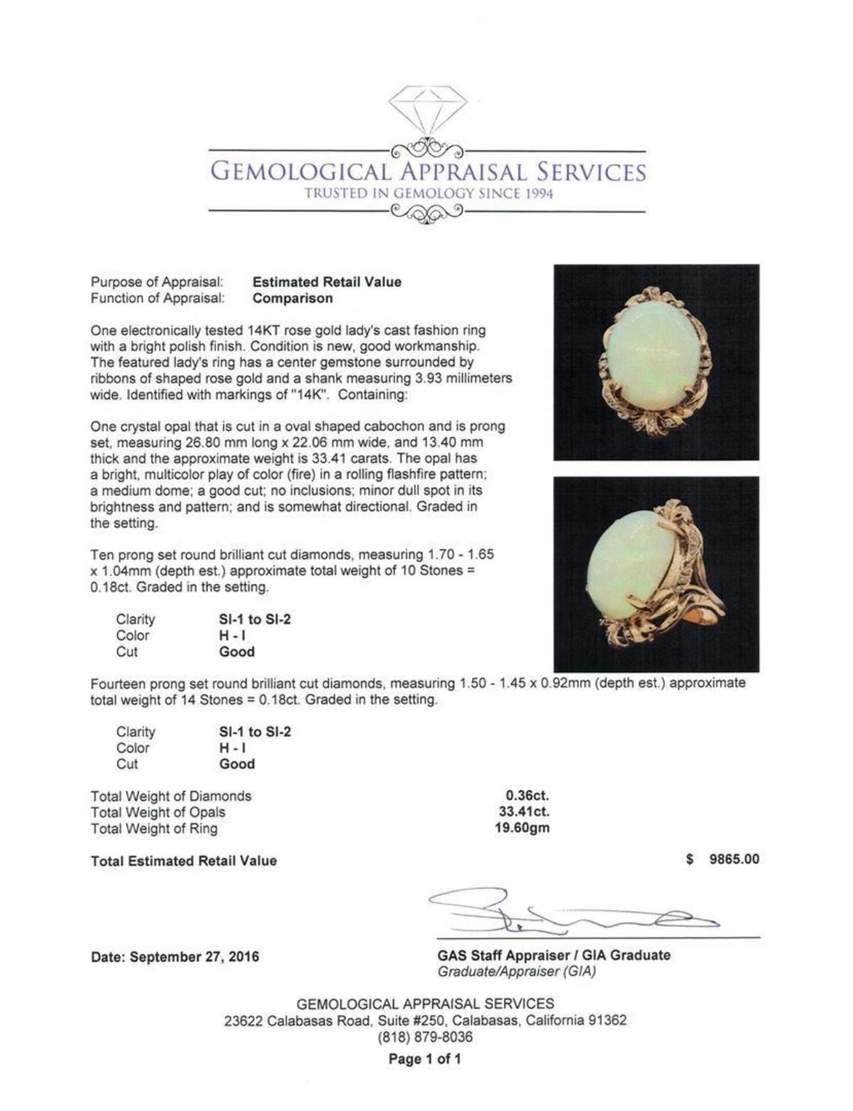 One electronically tested 14KT rose gold lady's cast fashion ring with a bright polish finish. The featured lady's ring has a center gemstone surrounded by ribbons of shaped rose gold and a shank measuring 3.93 millimeters wide. Identified with markings of '14K'. Condition is new, good workmanship. Containing: One crystal opal that is cut in a oval shaped cabochon and is prong set, measuring 26.80 mm long x 22.06 mm wide, and 13.40 mm thick and the approximate weight is 33.41 carats. The opal has a bright, multicolor play of color (fire) in a rolling flashfire pattern; a medium dome; a good cut; no inclusions; minor dull spot in its brightness and pattern; and is somewhat directional. Graded in the setting. Ten prong set round brilliant cut diamonds, measuring 1.70 - 1.65 x 1.04mm (depth est.) approximate total weight of 10 Stones = 0.18ct. Graded in the setting. Clarity SI-1 to SI-2. Color: H - I Cut Good Fourteen prong set round brilliant cut diamonds, measuring 1.50 - 1.45 x 0.92mm (depth est.) approximate total weight of 14 Stones = 0.18ct. Graded in the setting. Clarity SI-1 to SI-2. Color: H - I Cut Good. Total Weight of Diamonds 0.36ct.. Total Weight of Opals 33.41ct.. Total Weight of Ring 19.60gm. GAS Appraised.