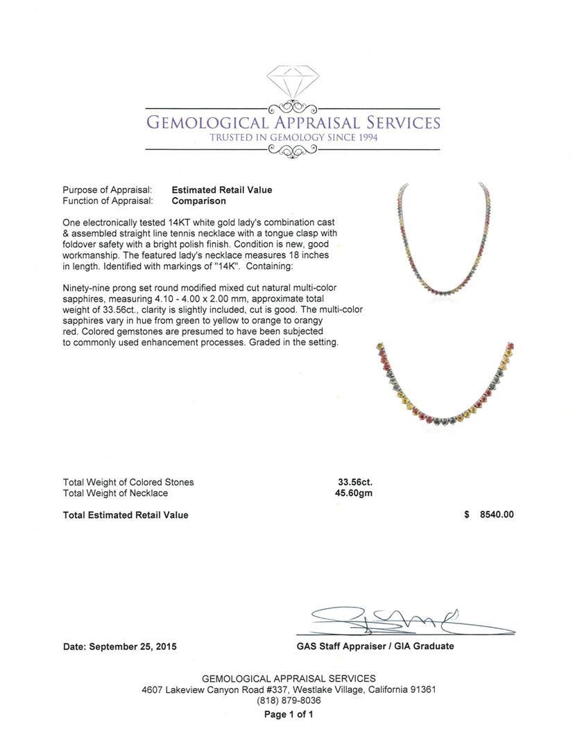 One electronically tested 14KT white gold lady's combination cast & assembled straight line tennis necklace with a tongue clasp with foldover safety with a bright polish finish. The featured lady's necklace measures 18 inches in length. Identified with markings of "14K". Condition is new, good workmanship. Containing: Ninety-nine prong set round modified mixed cut natural multi-color sapphires, measuring 4.10 - 4.00 x 2.00 mm, approximate total weight of 33.56ct., clarity is slightly included, cut is good. The multi-color sapphires vary in hue from green to yellow to orange to orangy red. Colored gemstones are presumed to have been subjected to commonly used enhancement processes. Graded in the setting. Total Weight of Colored Stones 33.56ct. Total Weight of Necklace 45.60gm at $8540.00.. GAS Appraised.
