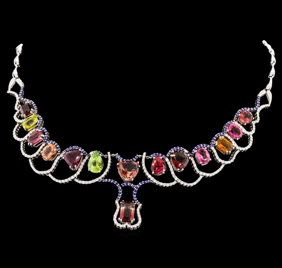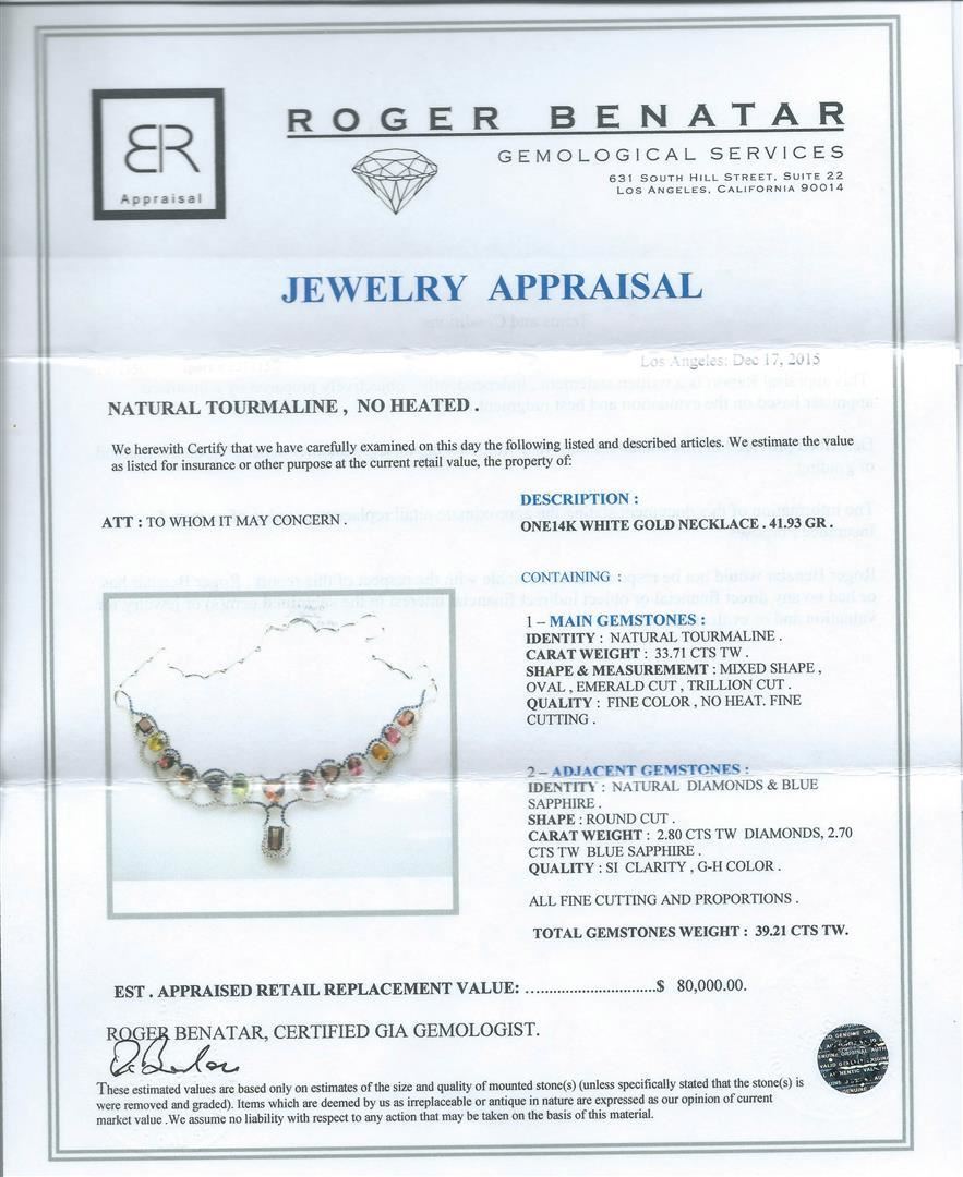 One electronically tested 14KT white gold necklace weighing 41.93 grams including 14 mixed shape tourmaline with a total weight of 33.71ctw, Round cut diamonds weighing 2.80 ctw and round cut blue sapphire weighing 2.70 ctw. SI clarity, G-H color. All fine cutting and proportions. RBGS Appraised.