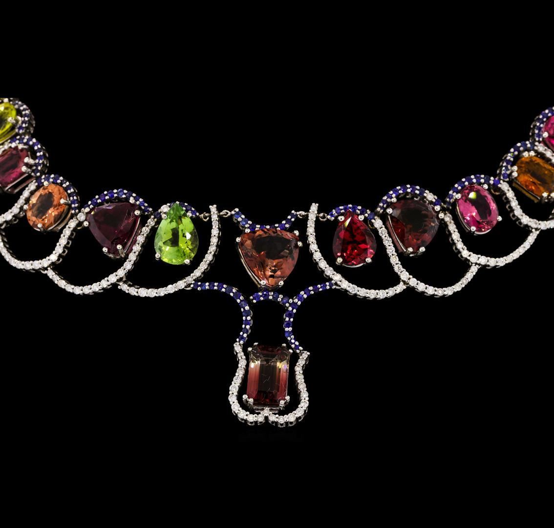One electronically tested 14KT white gold necklace weighing 41.93 grams including 14 mixed shape tourmaline with a total weight of 33.71ctw, Round cut diamonds weighing 2.80 ctw and round cut blue sapphire weighing 2.70 ctw. SI clarity, G-H color. All fine cutting and proportions. RBGS Appraised.