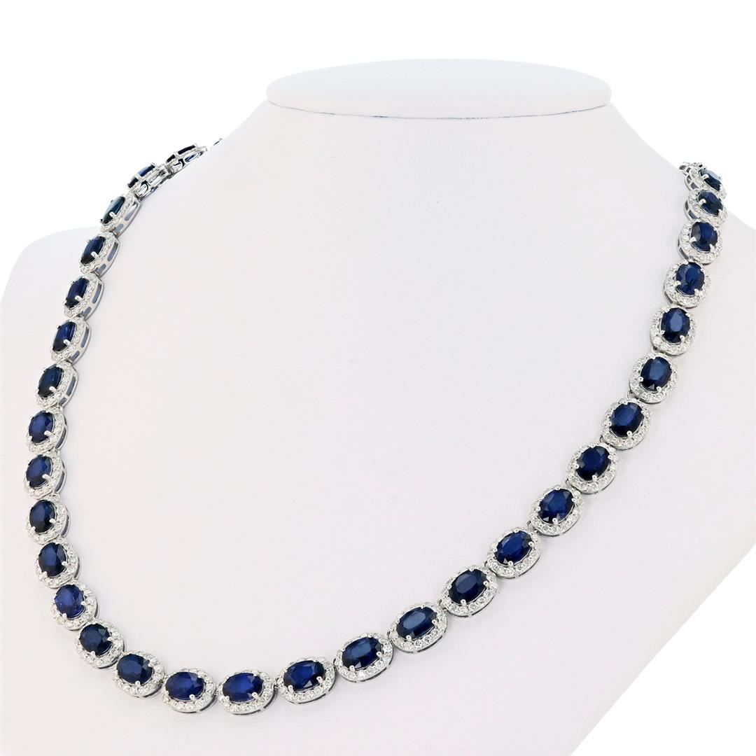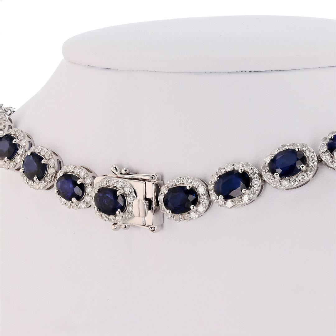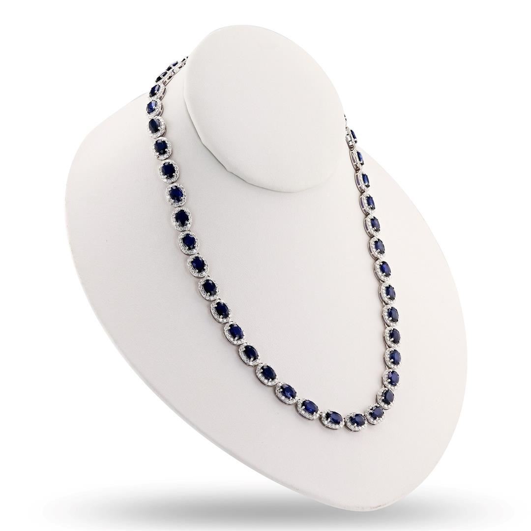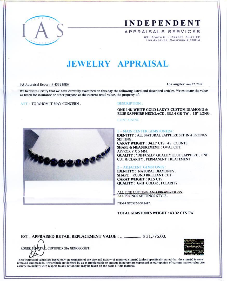 DESCRIPTION ONE 14K WHITE GOLD LADY'S CUSTOM DIAMOND AND BLUE SAPPHIRE NECKLACE. 33.14 GR TW. 16" LONG. 1-MAIN CENTER GEMSTONE(S) IDENTITY: ALL NATURAL SAPPHIRE SET IN 4 PRONGS SETTING. CARAT WEIGHT: 34.17 CTS. 42 COUNTS. SHAPE AND MEASUREMEMT: OVAL CUT. APPROX 7 X 5 MM. QUALITY: "DIFFUSED" QUALITY BLUE SAPPHIRE, FINE CUT AND CLARITY. PERMANENT TREATEMENT 2- ADJACENT GEMSTONES IDENTITY: NATURAL DIAMONDS. SHAPE: ROUND BRILLIANT CUT. CARAT WEIGHT: 9.15 CTS. QUALITY: G-H COLOR, I CLARITY. ALL FINE CUTTING AND PROPORTIONS ALL PRONGS SETTINGS STYLE. TOTAL GEMSTONES WEIGHT : 43.32 CTS TW.