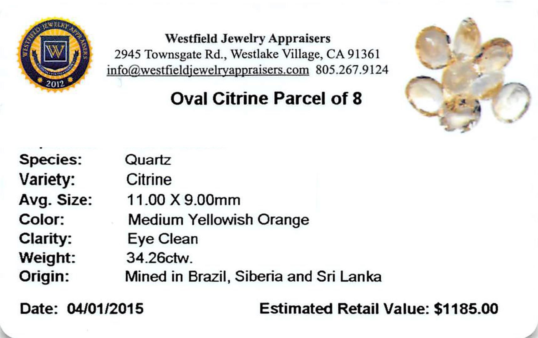 Eight oval mixed cut natural citrine quartzs exact total weight 34.26ct., clarity is eye clean, type I, medium, slightly brownish, yellowish orange color, (GIA yO 5/2), cut is good. Westfield Appraised.