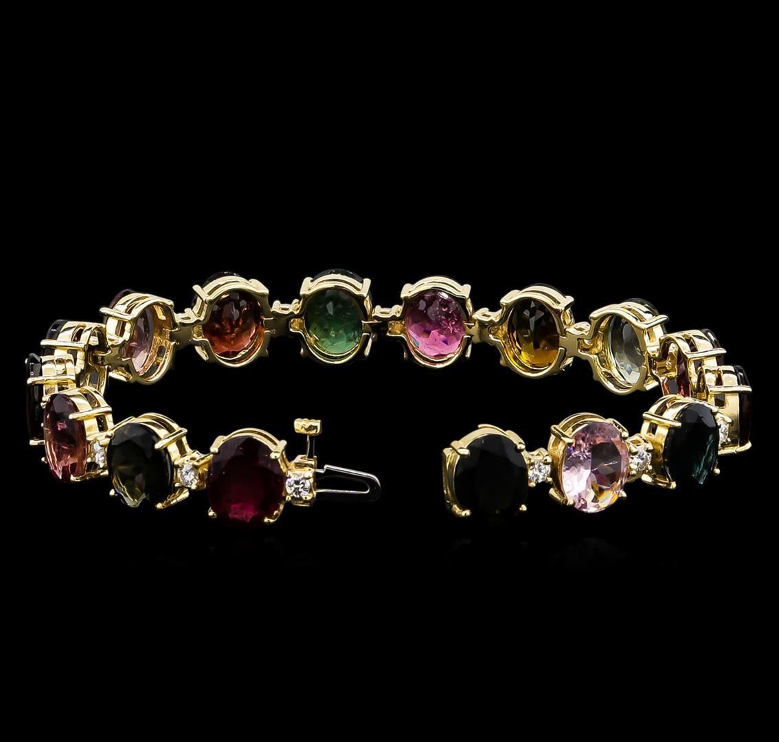 One electronically tested 14KT yellow gold lady's combination cast & assembled fashion bracelet with a tongue clasp with foldover safety with a bright polish finish. The featured lady's bracelet measures 7 inches in length. Identified with markings of "14K". Condition is new, good workmanship. Containing: Sixteen prong set oval modified brilliant cut natural multi-color tourmalines, measuring 9.95 x 7.50 x 4.56mm, approximate total weight of 35.00ct., clarity is eye clean, type II, cut is good. The featured tourmalines range in color from green to greenish orange to orangish red to pink. Colored gemstones are presumed to have been subjected to commonly used enhancement processes. Graded in the setting. Sixteen prong set round brilliant cut diamonds, measuring 2.60 - 2.50 x 1.58mm (depth est.) approximate total weight of 16 Stones = 1.00ct. Graded in the setting. Clarity: VS-2 to SI-2. Color: G - I. Cut Very Good. Total Weight of Colored Stones 35.00ct. Total Weight of Diamonds 1.00ct. Total Weight of Bracelet 23.50gm. GAS Appraised.