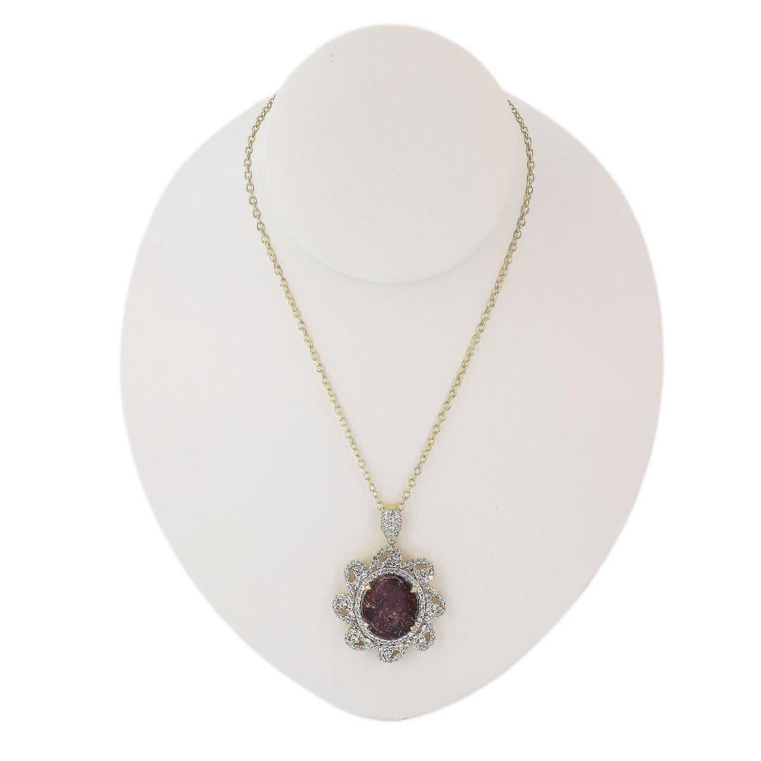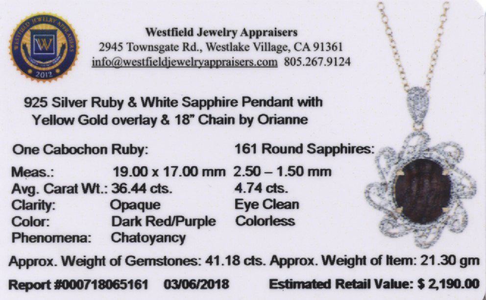 One electronically tested 925 silver ladies cast and assembled ruby and sapphire pendant with 18†chain. Trademark is Orianne. Identified with markings of "925". Condition is new, good workmanship. Containing: One prong set oval cabochon cut natural ruby, measuring 19.00 x 17.00 x 11.05mm, approximate weight of 36.44ct., type II, dark, brownish, strongly purplish red color, (GIA stpR 7/1), cut is good. One hundred sixty-one prong set round mixed cut natural white sapphires, measuring 2.50 - 1.50 x 1.31 mm, approximate total weight of 4.74ctw., clarity is eye clean, colorless, very slightly grayish, white color, (GIA W 0/3), cut is good. Total Weight of Colored Stones 41.18ctw. Total Weight of Pendant With Chain 21.30 gm #LREF-598
