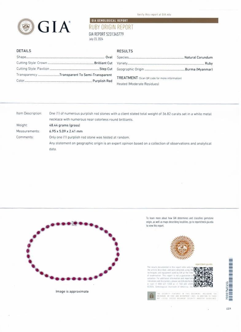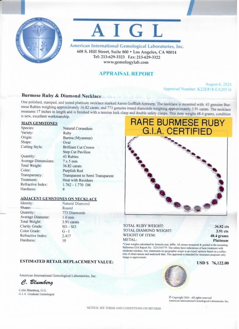One polished, stamped, and tested platinum necklace marked Aaron Gofflieb Antwerp. The necklace is mounted with: 43 genuine Burmese Rubies weighing approximately 36.82 carats, and 773 genuine round diamonds weighing approximately 3.91 carats. The necklace measures 17 inches in length and is finished with a tension lock clasp and double safety clasps. This item weighs 48.4 grams, condition is new, excellent workmanship. #MAIN GEMSTONES# Species: Natural Corundum Variety: Ruby Origin: Burma (Myanmar) Shape: Oval Cutting Style: Brilliant Cut Crown, Step Cut Pavilion Quantity: 43 Rubies Average Dimensions: 7 x Smm Total Weight: 36.82 carats Color: Purplish Red Transparency: Transparent to Semi Transparent Treatment: Heat with Residues Refractive Index: 1.762 - 1.770 DR Hardness: 9 #ADJACENT GEMSTONES ON NECKLACE# Identity: Natural Diamond Shape: Round Quantity: 773 Diamonds Average Diameter: 1.0mm Total Weight: 3.91 carats Clarity Grade: SI1-SI3 Color Grade: G-I Refractive Index: 2.417 Hardness: 10 TOTAL RUBY WEIGHT: 36.82 cts TOTAL DIAMOND WEIGHT: 3.91 cts WEIGHT OF ITEM: 48.4 grams METAL: Platinum Size: 17