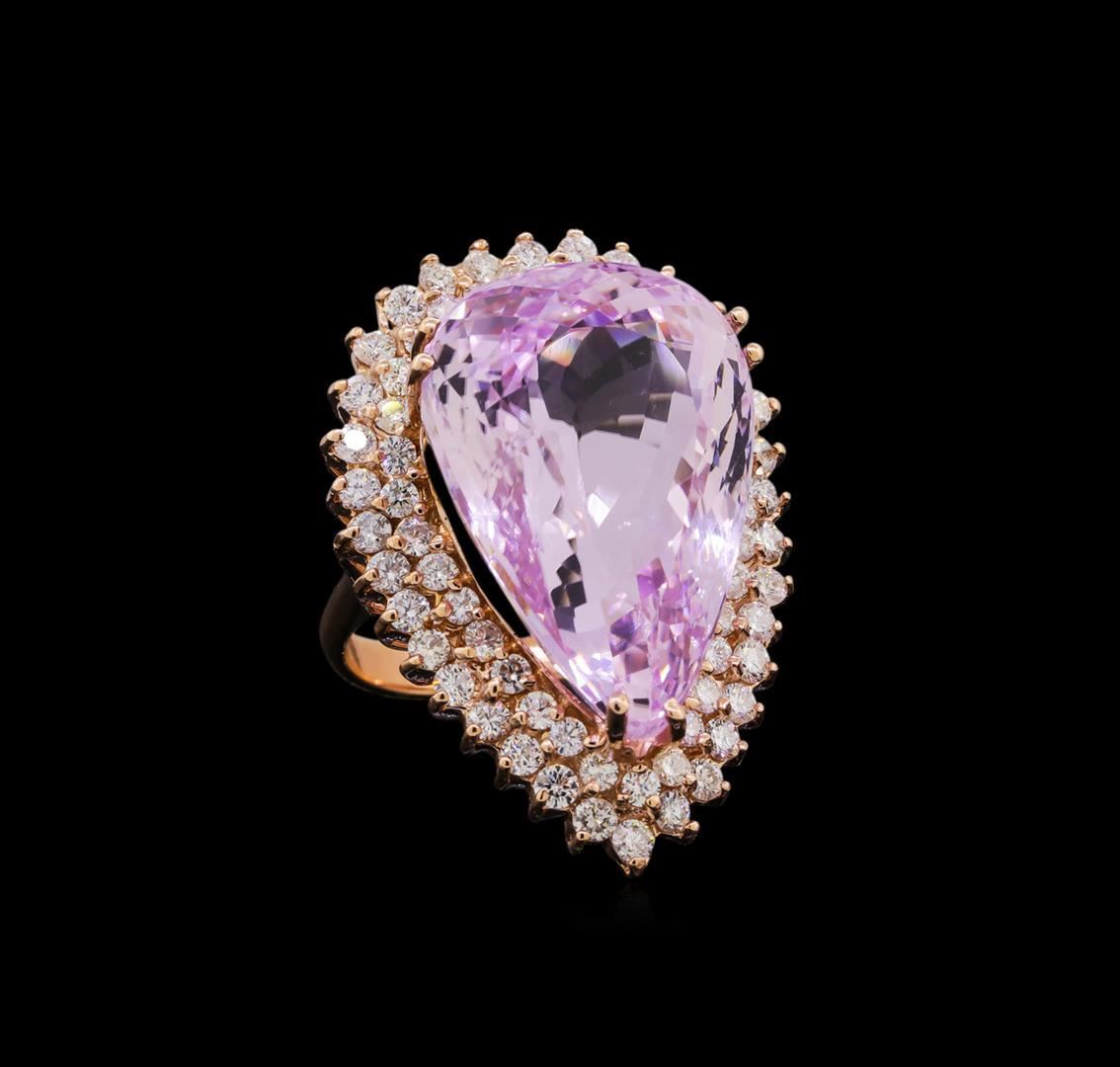 One electronically tested 14KT rose gold lady's cast fashion ring with a double basket halo with a bright polish finish. The featured lady's ring has a shank measuring 2.78 millimeters in width. Identified with markings of "14K". Condition is new, good workmanship. Containing: One prong set pear modified brilliant cut natural kunzite, measuring 25.60 x 17.60 x 12.30mm, (depth est.) approximate weight of 38.24ct., clarity is eye clean, light, moderately strong, purple red color, (GIA PR 3/4), cut is very good. Transmitting light with no distortion, transparent. Colored gemstones are presumed to have been subjected to commonly used enhancement processes. Graded in the setting. Thirty-Four prong set round brilliant cut diamonds, measuring 2.30 - 2.25 x 1.39mm (depth est.) approximate total weight of 34 Stones = 1.48ct. Graded in the setting. Clarity: SI-1 to SI-2. Color: H - I. Cut Good Thirty-Three prong set round brilliant cut diamonds, measuring 2.00 - 1.95 x 1.23mm (depth est.) approximate total weight of 33 Stones = 1.06ct. Graded in the setting. Clarity: SI-1 to SI-2. Color: H - I. Cut Good. Total Weight of Colored Stones 38.24ct. Total Weight of Diamonds 2.54ct. Total Weight of Ring 18.50gm. GAS Appraised.