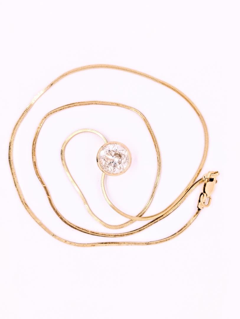 This 14KT yellow gold necklace features a bezel-set round brilliant cut diamond weighing approximately 4.00ct, graded I-1 clarity, I color, and Very Good cut. The diamond measures 9.95 x 9.90mm with an estimated depth of 6.24mm and is graded in the setting. The pendant is suspended on an 18-inch, 1mm square foxtail chain with a lobster claw clasp. With a bright polished finish and markings of "14K," the piece is in like-new condition and weighs 6.60 grams in total.