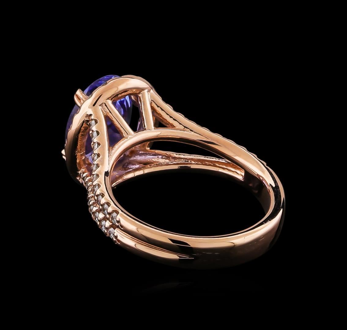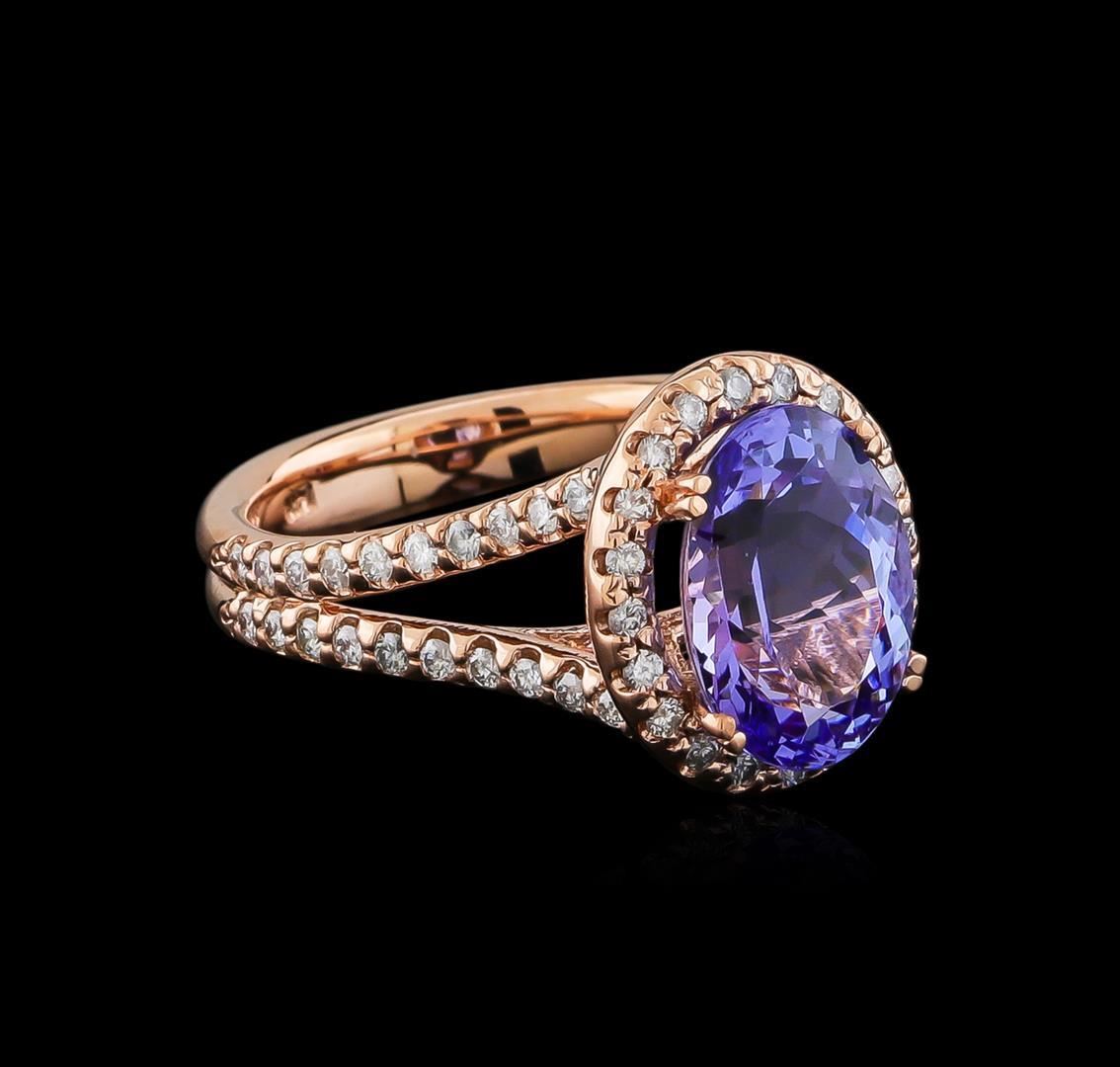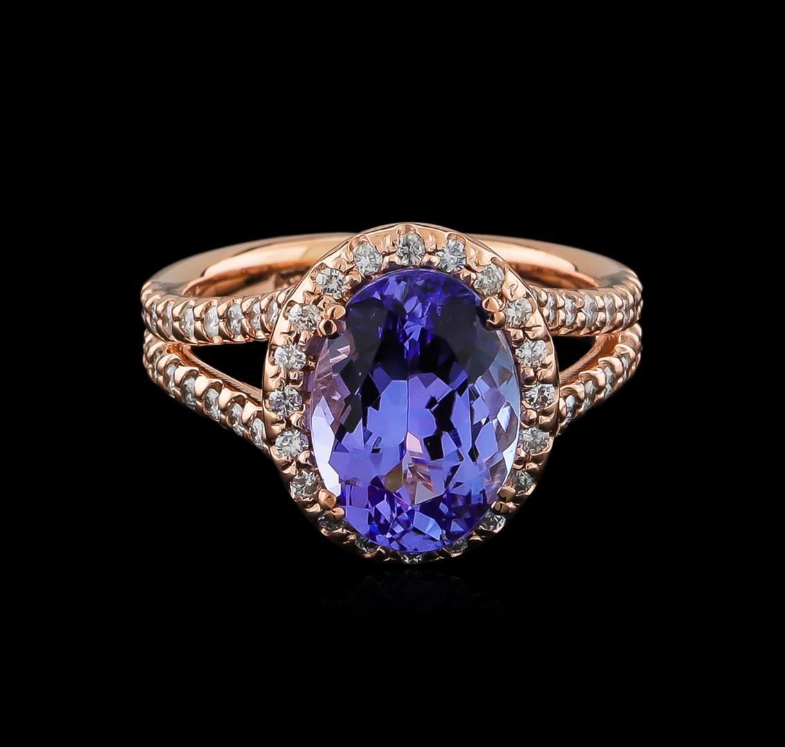 One electronically tested 14KT rose gold lady's cast fashion ring with a split shank halo with a bright polish finish. The featured lady's ring has a shank measuring 3.88 millimeters wide. Identified with markings of "14K". Condition is new, good workmanship. Containing: One prong set oval modified brilliant cut natural tanzanite, measuring 11.70 x 8.50 x 5.88mm, approximate weight of 4.01ct., clarity is eye clean, type I, medium, moderately strong, bluish violet color, (GIA bV 5/4), cut is very good. Transmitting light with no distortion, transparent. Colored gemstones are presumed to have been subjected to commonly used enhancement processes. Graded in the setting. Sixty prong set round brilliant cut diamonds, measuring 1.40 - 1.30 x 0.84mm (depth est.) approximate total weight of 60 Stones = 0.57ct. Graded in the setting. Clarity: SI-1 to I-1. Color: H - I. Cut Good. Total Weight of Colored Stones 4.01ct. Total Weight of Diamonds 0.57ct. Total Weight of Ring 7.30gm. GAS Appraised.