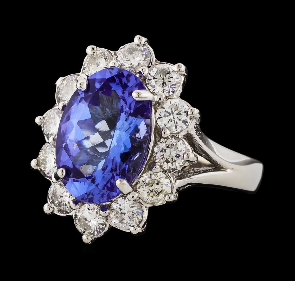One electronically tested 14KT white gold lady's cast fashion ring with a split shank basket halo with a bright polish finish. The featured lady's ring has a shank measuring 2.94 millimeters wide. Identified with markings of '14K'. Condition is new, good workmanship. Containing: One prong set oval modified brilliant cut natural tanzanite, measuring 12.38 x 8.58 x 5.50mm, (depth est.) approximate weight of 4.01ct., clarity is eye clean, medium light, moderately strong, violet color, (GIA V 4/4), cut is very good. Transmitting light with no distortion, transparent. Colored gemstones are presumed to have been subjected to commonly used enhancement processes. Graded in the setting. Twelve prong set round brilliant cut diamonds, measuring 3.10 - 3.00 x 1.89mm (depth est.) approximate total weight of 12 Stones = 1.30ct. Graded in the setting. Clarity SI-1 to SI-2. Color: H - I Cut Good. Total Weight of Colored Stones 4.01ct.. Total Weight of Diamonds 1.30ct.. Total Weight of Ring 7.60gm. GAS Appraised.