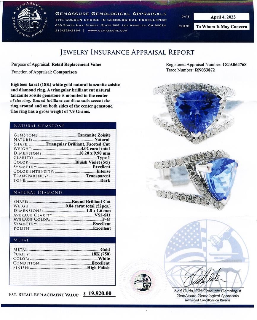 4.02ct Tanzanite and 0.84ctw Diamond 18K White Gold Ring. Eighteen karat (18K) white gold natural tanzanite zoisite and diamond ring. A triangular brilliant cut natural tanzanite zoisite gemstone is mounted in the center of the ring. Round brilliant cut diamonds accent the ring around and on both sides of the center gemstone. The ring has a gross weight of 7.9 Grams. NATURAL GEMSTONE GEMSTONE: Tanzanite Zoisite NATURE: Natural SHAPE: Triangular Brilliant, Faceted Cut WEIGHT: 4.02 carat total DIMENSIONS: 10.20 x 9.90mm CLARITY: Type 1 COLOR: Bluish Violet (5/5) SYMMETRY: Excellent COLOR INTENSITY: Intense TRANSPARENCY: Transparent TONE: Dark NATURAL DIAMOND SHAPE: Round Brilliant Cut WEIGHT: 0.84 carat total (52pcs.) DIMENSIONS: 1.8 x 1.6mm AVERAGE CLARITY: VS2-SI1 AVERAGE COLOR: F-G SYMMETRY: Excellent POLISH: Excellent METAL METAL: Gold PURITY: 18K (750) COLOR: White CONDITION: Excellent FINISH: High Polish