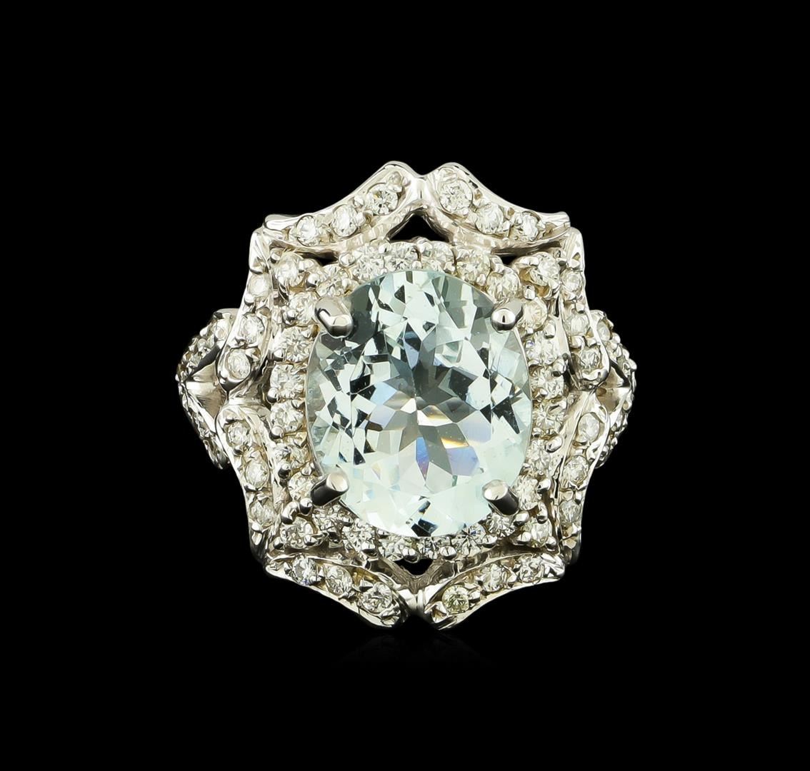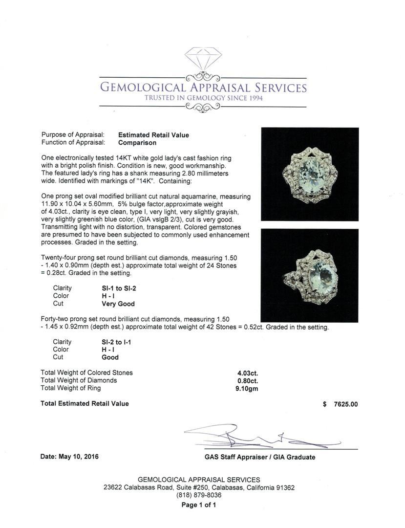 One electronically tested 14KT white gold lady's cast fashion ring with a bright polish finish. The featured lady's ring has a shank measuring 2.80 millimeters wide. Identified with markings of "14K". Condition is new, good workmanship. Containing: One prong set oval modified brilliant cut natural aquamarine, measuring 11.90 x 10.04 x 5.60mm, 5%. bulge factor, approximate weight of 4.03ct., clarity is eye clean, type I, very light, very slightly grayish, very slightly greenish blue color, (GIA vslgB 2/3), cut is very good. Transmitting light with no distortion, transparent. Colored gemstones are presumed to have been subjected to commonly used enhancement processes. Graded in the setting. Twenty-Four prong set round brilliant cut diamonds, measuring 1.50 - 1.40 x 0.90mm (depth est.) approximate total weight of 24 Stones = 0.28ct. Graded in the setting. Clarity: SI-1 to SI-2. Color: H - I. Cut Very Good Forty-Two prong set round brilliant cut diamonds, measuring 1.50 - 1.45 x 0.92mm (depth est.) approximate total weight of 42 Stones = 0.52ct. Graded in the setting. Clarity: SI-2 to I-1. Color: H - I. Cut Good. Total Weight of Colored Stones 4.03ct. Total Weight of Diamonds 0.80ct. Total Weight of Ring 9.10gm. GAS Appraised.
