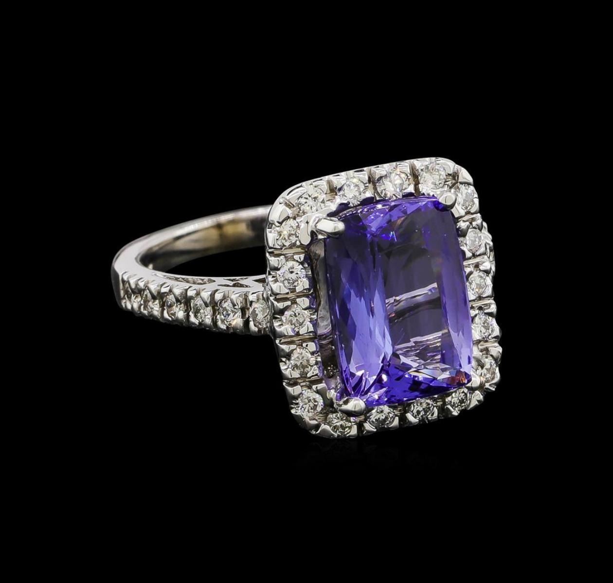 One electronically tested 14KT white gold lady's cast fashion ring with a cathedral shank with a basket halo with a bright polish finish. The featured lady's ring has a shank measuring 2.25 millimeters wide. Identified with markings of '14K'. Condition is new, good workmanship. Containing: One prong set rectangular cushion modified brilliant cut natural tanzanite, measuring 11.43 x 7.98 x 5.04mm, (depth est.) 12%. bulge factor, approximate weight of 4.03ct., clarity is eye clean, medium light, very slightly grayish, bluish violet color, (GIA bV 4/3), cut is good. Transmitting light with no distortion, transparent. Colored gemstones are presumed to have been subjected to commonly used enhancement processes. Graded in the setting. Thirty prong set round brilliant cut diamonds, measuring 1.70 - 1.60 x 1.02mm (depth est.) approximate total weight of 30 Stones = 0.52ct. Graded in the setting. Clarity SI-1 to I-1. Color: H - I Cut Good. Total Weight of Colored Stones 4.03ct.. Total Weight of Diamonds 0.52ct.. Total Weight of Ring 7.40gm