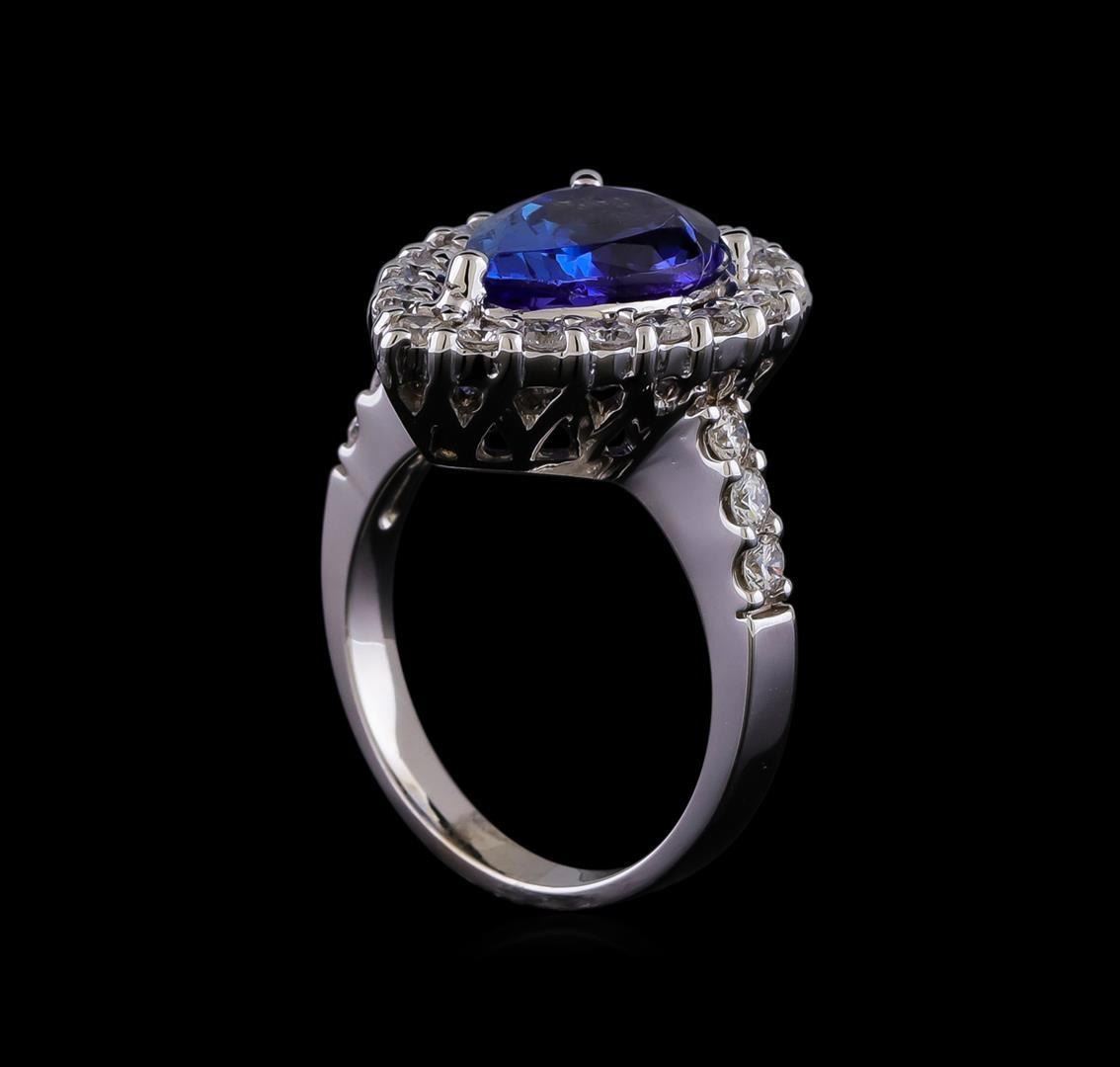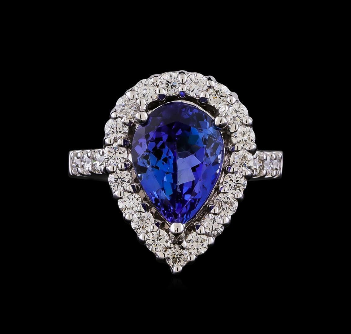 One electronically tested 14KT white gold lady's cast fashion ring with a basket halo with a bright polish finish. The featured lady's has a shank measuring 2.70 millimeters in width. Identified with markings of "14K". Condition is new, good workmanship. Containing: One prong set pear modified brilliant cut natural tanzanite, measuring 12.20 x 8.67 x 5.53mm, (depth est.) approximate weight of 4.03ct., clarity is eye clean, medium, very slightly grayish, bluish violet color, (GIA bV 5/3), cut is very good. Transmitting light with no distortion, transparent. Colored gemstones are presumed to have been subjected to commonly used enhancement processes. Graded in the setting. Twenty-Five prong set round brilliant cut diamonds, measuring 2.30 - 2.20 x 1.37mm (depth est.) approximate total weight of 25 Stones = 1.04ct. Graded in the setting. Clarity: VS-2 to SI-2. Color: H - I. Cut Good. Total Weight of Colored Stones 4.03ct. Total Weight of Diamonds 1.04ct. Total Weight of Ring 7.20gm.
