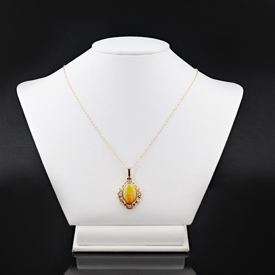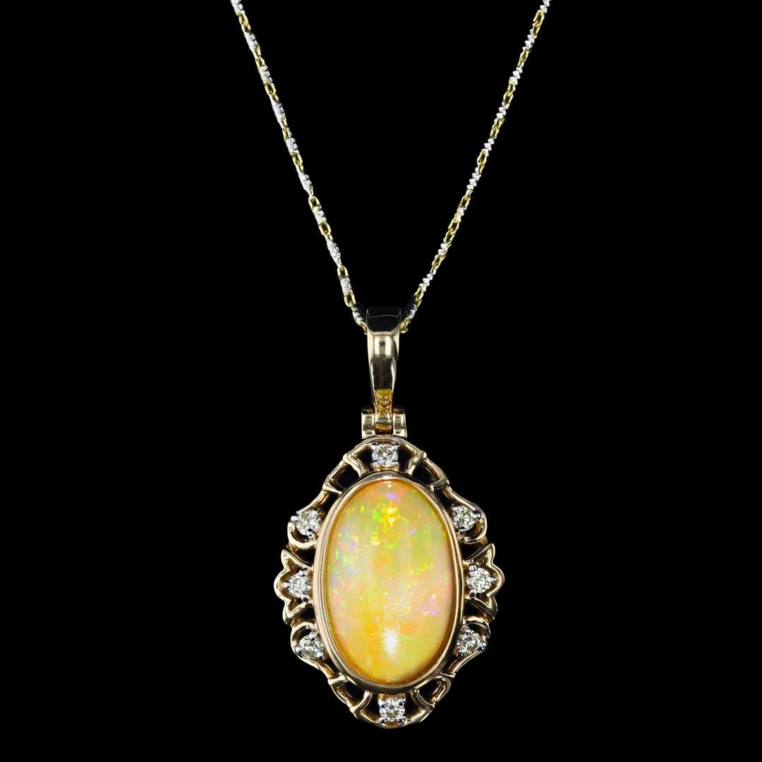 4.05ct Opal and 0.28ctw Diamond 14K Yellow Gold Pendant. ONE 14K YELLOW GOLD LADY'S CUSTOM MADE DIAMOND and OPAL PENDANT ON LINK CHAIN . 7.60 GR TW. 18" LONG 1 - MAIN CENTER GEMSTONE(S): IDENTITY: ONE CENTER NATURAL OPAL SET IN BEZEL SETTING STYLE CARAT WEIGHT: 4.05 CTS SHAPE and MEASUREMEMT: OVAL CABOCHON QUALITY: WHITE OPAL WITH MULTI PLAY OF COLORS 2 ADJACENT GEMSTONES: IDENTITY: NATURAL DIAMONDS SHAPE: ROUND BRILLIANT CUT CARAT WEIGHT: 0.28 CT TW QUALITY: H/J COLOR RANGE , SI CLARITY RANGE ALL FINE CUTTING AND PROPORTIONS ALL PRONGS/BEZEL SETTINGS STYLE TOTAL GEMSTONES WEIGHT: 4.33 CTS TW.