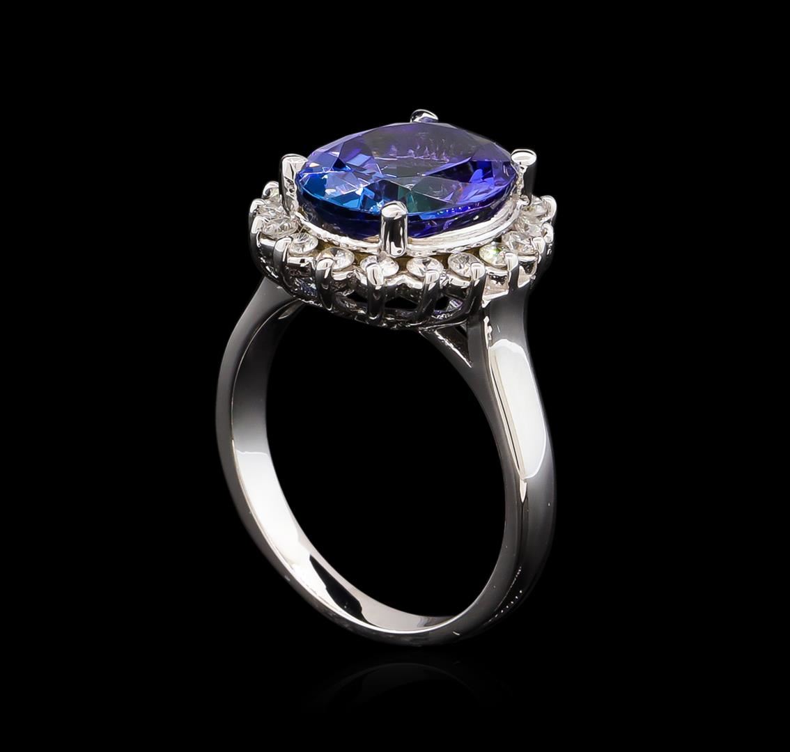 One electronically tested 14KT white gold lady's cast fashion ring with a basket halo with a bright polish finish. The featured lady's ring has a shank measuring 2.48 millimeters wide. Identified with markings of "14K". Condition is new, good workmanship. Containing: One prong set oval modified brilliant cut natural tanzanite, measuring 12.08 x 8.95 x 5.48mm, approximate weight of 4.05ct., clarity is eye clean, type I, medium dark, moderately strong, violetish blue color, (GIA vB 6/4), cut is very good. Transmitting light with no distortion, transparent. Colored gemstones are presumed to have been subjected to commonly used enhancement processes. Graded in the setting. Eighteen prong set round brilliant cut diamonds, measuring 1.90 - 1.80 x 1.15mm (depth est.) approximate total weight of 18 Stones = 0.44ct. Graded in the setting. Clarity: SI-1 to SI-2. Color: H - I. Cut Good. Total Weight of Colored Stones 4.05ct. Total Weight of Diamonds 0.44ct. Total Weight of Ring 5.90gm. GAS Appraised at $8,845.00.