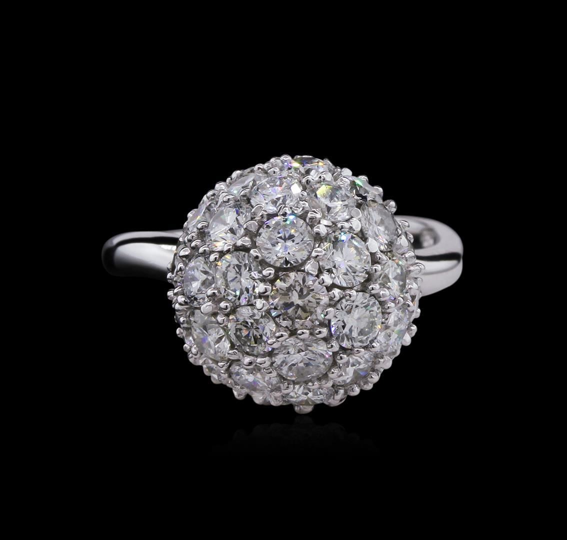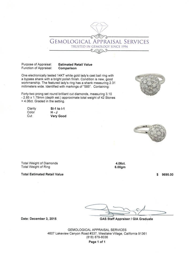 One electronically tested 14KT white gold lady's cast ball ring with a bypass shank with a bright polish finish. The featured lady's ring has a shank measuring 2.31 millimeters wide. Identified with markings of "585". Condition is new, good workmanship. Containing: Forty-Two prong set round brilliant cut diamonds, measuring 3.10 - 2.85 x 1.79mm (depth est.) approximate total weight of 42 Stones = 4.06ct. Graded in the setting. Clarity: SI-1 to I-1. Color: H - Very Good. Total Weight of Diamonds 4.06ct. Total Weight of Ring 6.00gm. GAS Appraised.