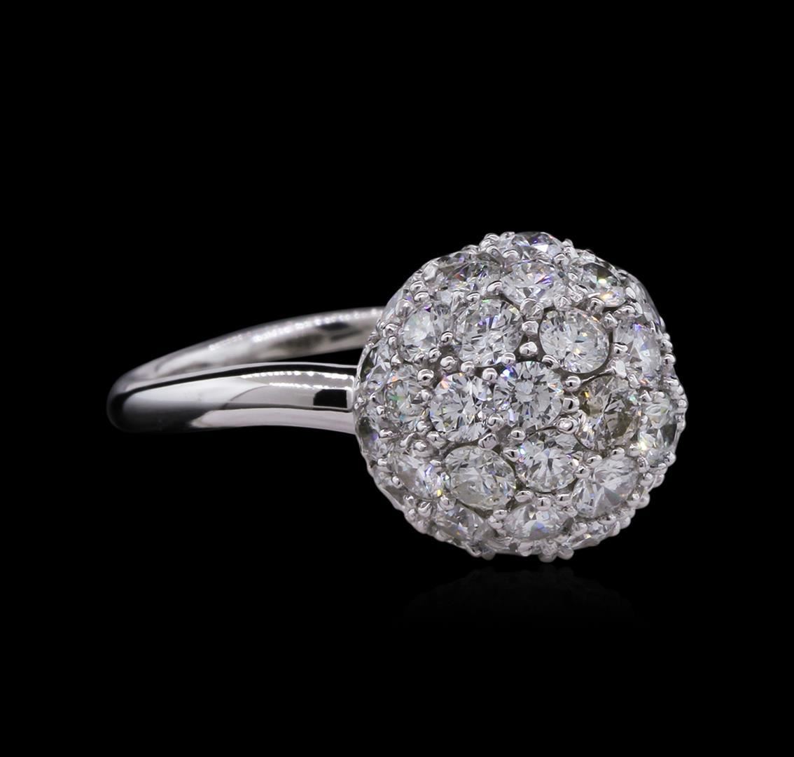 One electronically tested 14KT white gold lady's cast ball ring with a bypass shank with a bright polish finish. The featured lady's ring has a shank measuring 2.31 millimeters wide. Identified with markings of "585". Condition is new, good workmanship. Containing: Forty-Two prong set round brilliant cut diamonds, measuring 3.10 - 2.85 x 1.79mm (depth est.) approximate total weight of 42 Stones = 4.06ct. Graded in the setting. Clarity: SI-1 to I-1. Color: H - Very Good. Total Weight of Diamonds 4.06ct. Total Weight of Ring 6.00gm. GAS Appraised.