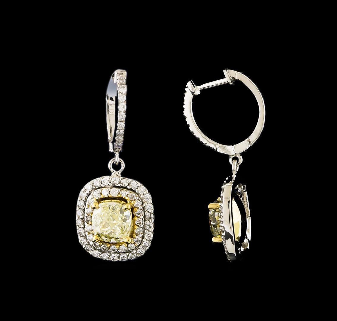 One pair electronically tested 14KT white and yellow gold lady's combination cast & assembled fashion earrings with hinged, snap locking posts with a double cushion halo with a bright polish finish. Identified with markings of "K14". Condition is new, good workmanship. Containing: Two prong set cushion cut diamonds, measuring 6.50 x 6.40 x 4.10mm (depth est.) , 5.00.%. GTCF approximate total weight of 2 Stones = 3.06ct. Graded in the setting. Clarity: VS-2 to SI-1 Cut Very Good Seventy prong set round brilliant cut diamonds, measuring 1.40 - 1.35 x 0.86mm (depth est.) approximate total weight of 70 Stones = 0.70 ct. Graded in the setting. Clarity: SI-1 to I-1. Color: G - Good Forty prong set round brilliant cut diamonds, measuring 1.30 - 1.25 x 0.79mm (depth est.) approximate total weight of 40 Stones = 0.32ct. Graded in the setting. Clarity: SI-1 to I-1. Color: H - I. Cut Good. Total Weight of Diamonds 4.08ct. Total Weight of Earrings 7.40gm. GAS Appraised.