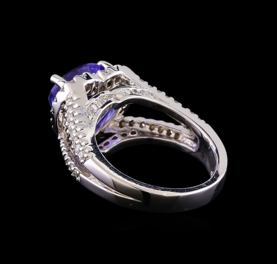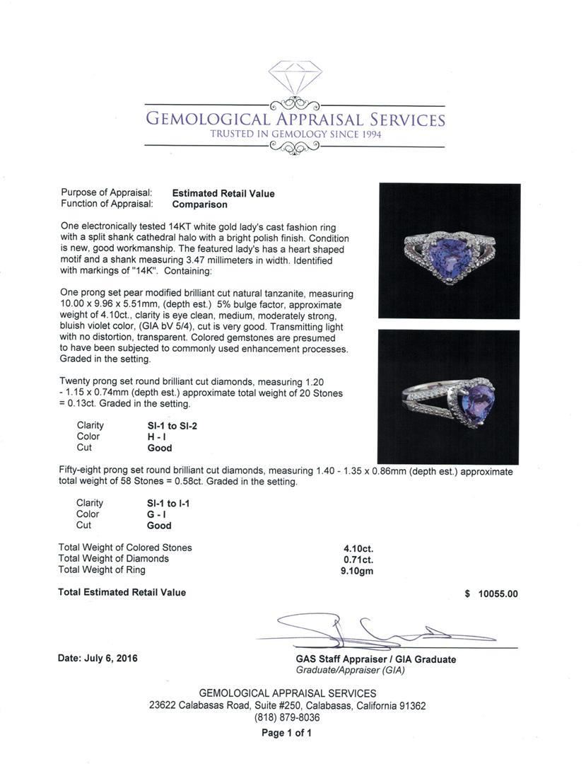 One electronically tested 14KT white gold lady's cast fashion ring with a split shank cathedral halo with a bright polish finish. The featured lady's has a heart shaped motif and a shank measuring 3.47 millimeters in width. Identified with markings of "14K". Condition is new, good workmanship. Containing: One prong set pear modified brilliant cut natural tanzanite, measuring 10.00 x 9.96 x 5.51mm, (depth est.) 5%. bulge factor, approximate weight of 4.10ct., clarity is eye clean, medium, moderately strong, bluish violet color, (GIA bV 5/4), cut is very good. Transmitting light with no distortion, transparent. Colored gemstones are presumed to have been subjected to commonly used enhancement processes. Graded in the setting. Twenty prong set round brilliant cut diamonds, measuring 1.20 - 1.15 x 0.74mm (depth est.) approximate total weight of 20 Stones = 0.13ct. Graded in the setting. Clarity: SI-1 to SI-2. Color: H - I. Cut Good Fifty-Eight prong set round brilliant cut diamonds, measuring 1.40 - 1.35 x 0.86mm (depth est.) approximate total weight of 58 Stones = 0.58ct. Graded in the setting. Clarity: SI-1 to I-1. Color: G - I. Cut Good. Total Weight of Colored Stones 4.10ct. Total Weight of Diamonds 0.71ct. Total Weight of Ring 9.10gm.