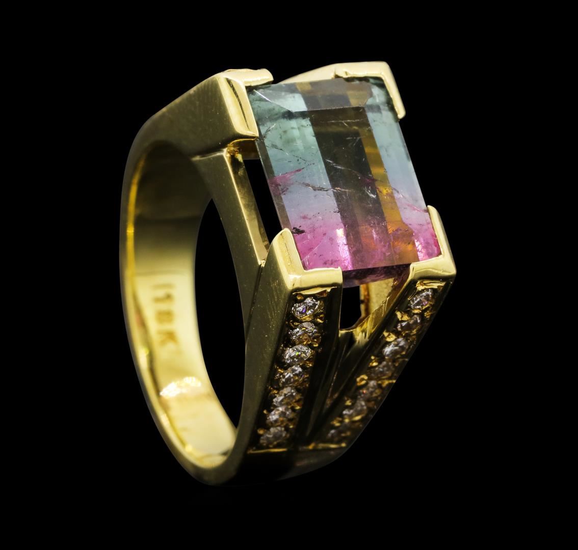 One electronically tested 18KT yellow gold lady's cast fashion ring with a split cathedral shank with a bright polish finish. The featured lady's ring has a shank measuring 3.70 millimeters wide. Identified with markings of '18K'. Condition is new, good workmanship. Containing: Twenty-Eight bead set round brilliant cut diamonds, measuring 1.60 - 1.50 x 0.96mm (depth est.) approximate total weight of 28 Stones = 0.40ct. Graded in the setting. Color H - I Clarity SI-1 to SI-2 Cut Good One prong set rectangular standard step cut natural bi-color tourmaline, measuring 11.00 x 8.30 x 4.67mm, (depth est.) 5%. bulge factor, approximate weight of 4.10ct., clarity is moderately included, light, moderately strong, very slightly bluish green color, (GIA vslbG 3/4), cut is good. The featured tourmaline ranges from very slightly bluish green to white to purplish red. Transmitting light somewhat diffusely, transparent to translucent. Indications of treatment. Colored gemstones are presumed to have been subjected to commonly used enhancement processes. Graded in the setting. Total Weight of Colored Stones 4.10ct.. Total Weight of Diamonds 0.40ct.. Total Weight of Ring 9.20gm GAS Appraised.